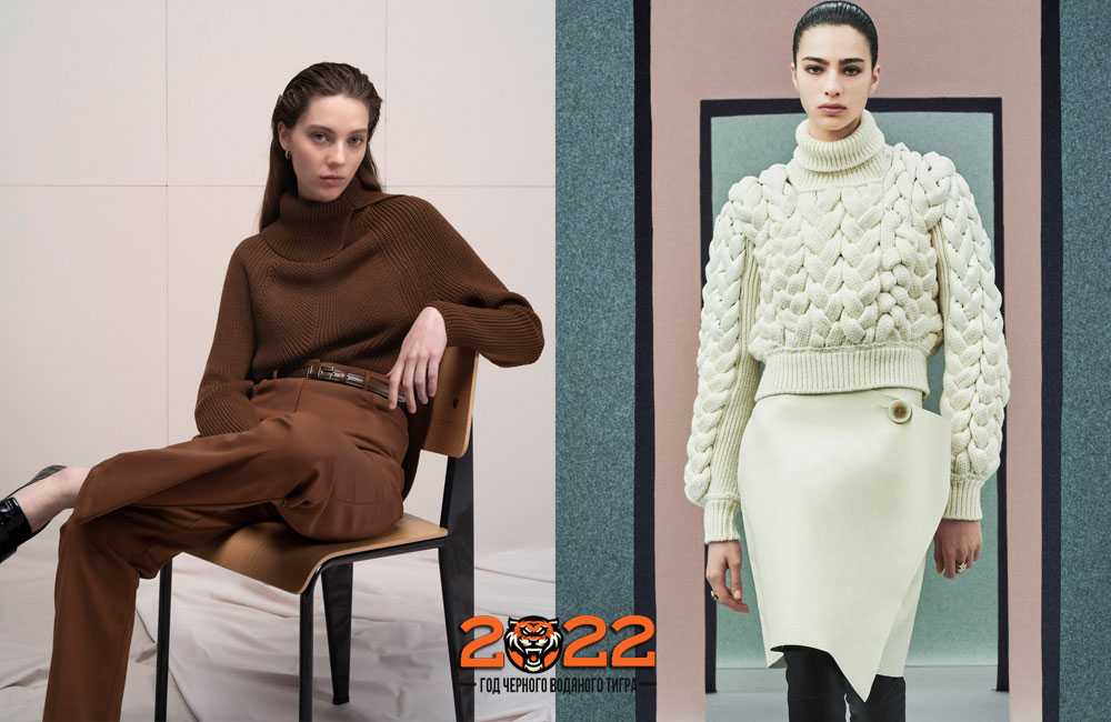 Мода на облегающие водолазки остается неизменной уже достаточно долго. В 2021-2022 году дизайнеры предлагают разбавить классические модели яркими цветами. Так, помимо кремовых, серых и универсальных черных водолазок, в образы стоит добавить зеленые, терракотовые, розовые, желтые, как у Hermès и Stella McCartney. В тренде будут также монохромные водолазки с горизонтальной полоской, как в коллекции Les Copains.
