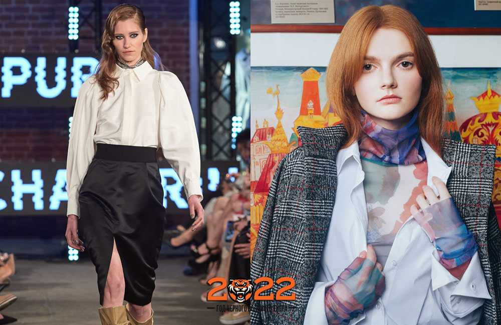 В сезоне осень-зима 2021-2022 элегантные белые блузы представили на мировых подиумах такие именитые дизайнеры, как Chapurin, Yeohlee, Braschi, Ruban, Raquel Allegra, Christian Dior, Valentino.