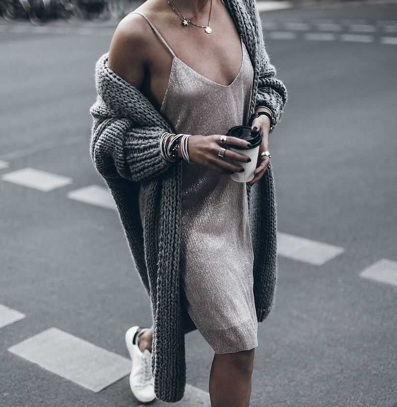 Смесь фактур только приветствуется. Поэтому модель оверсайз, связанная из толстой пряжи, актуальна по модным канонам для гладкого облегающего платья.