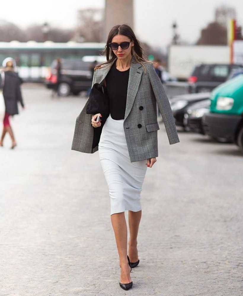 Еще более уравновешенный вариант – юбка-карандаш до середины бедра и классический приталенный блейзер с отворотами на рукавах и объемными плечами. Подберите блузу или топ незамысловатого фасона и сумочку в тон топу.