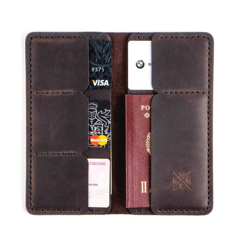Портмоне для документов немного больше стандартного кошелька. Характерными особенностями изделия является наличие вкладки под документы на автомобиль. Также имеются отделы для паспорта с обложкой, водительского удостоверения и т.д.