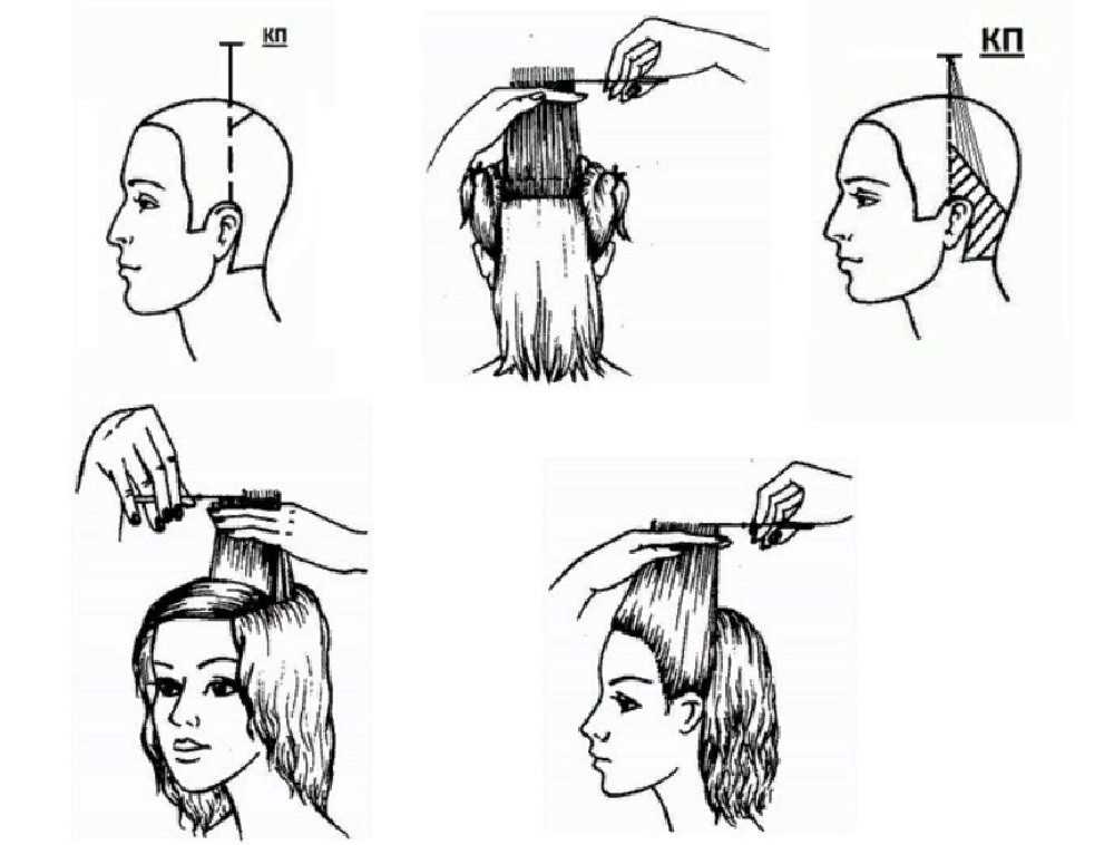 - Начиная с обработки затылка нужно вытягивать тонкие прядки вместе с контрольной перпендикулярно макушке и отстригать горизонтальным срезом.
