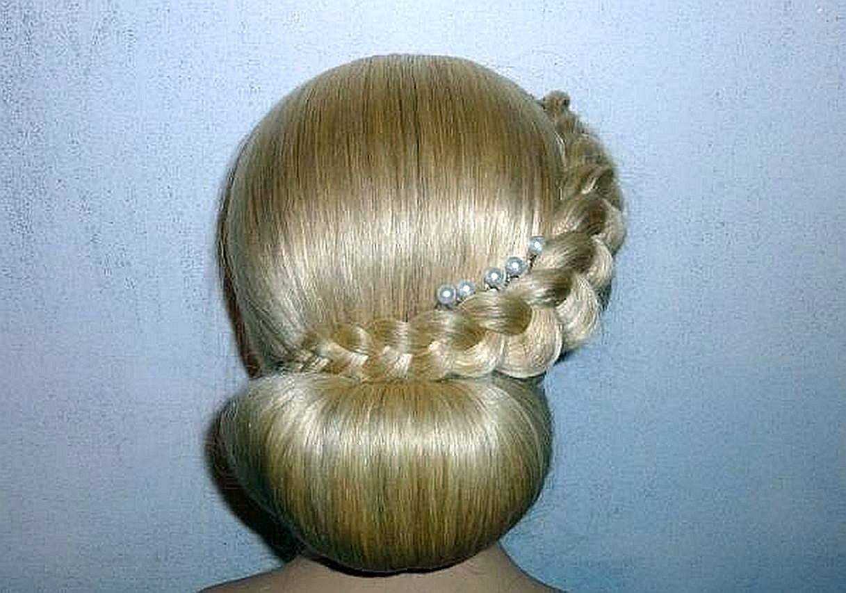 Причёска с косой. Очень эффектно будет выглядеть на обладательницах длинных локонов. Волосы стягиваются на макушке и заплетаются в колосок, боковые пряди которого слегка вытягиваются и распушаются для большей ширины и объёма. Волосы на макушке стягиваются объёмной резинкой, вокруг которой начинают оборачивать косу, закрепляя её шпильками. Кончик косы аккуратно прячут под бублик. Сверху распыляют лак для большей фиксации. Стильная и необычная причёска готова; её можно декорировать различными украшениями и аксессуарами для волос.