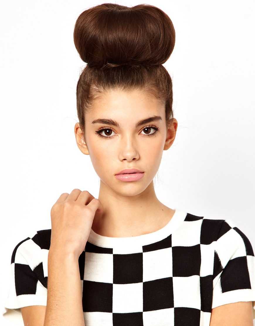 Причёска в стиле ретро. Выполняется классический пучок, который, впрочем, можно разнообразить, заплетя несколько прядей в тонкие косы. Каждая прядь облегает объёмную резинку и подкалывается заколкой, чтобы не было видно ни бублика, ни кончиков волос.