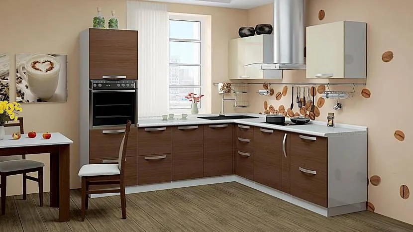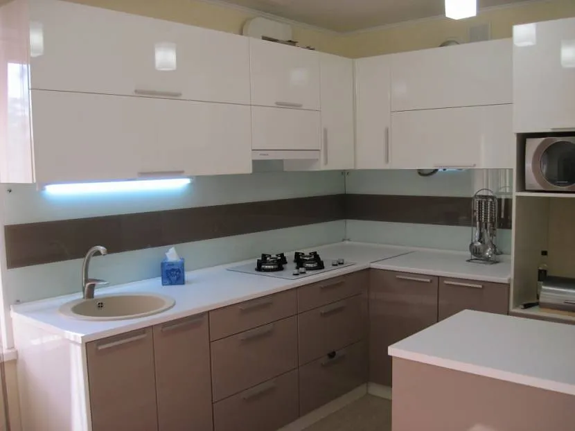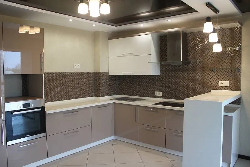 Угловая кухня с различными вариантами оформления гарнитура. Преобладает теплый молочно-кофейный оттенок. Небольшое количество верхних шкафчиков можно оформить в белоснежном тоне. Что касается фартука, то пиксельная плитка — это идеальный вариант. В таком дизайне хорошо смотрится металлическая фурнитура на фасаде. В подобного рода кухне приветствуется натяжной темно-коричневый потолок. Пол при этом находится в одной палитре с мебелью.