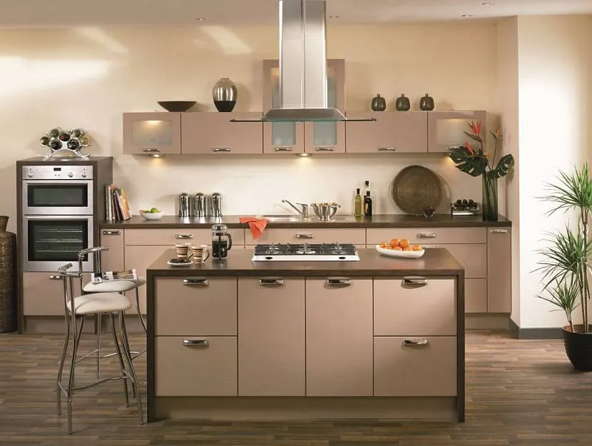 Большая просторная кухня будет шикарно смотреться с негабаритной мебелью. Темно-бежевый оттенок с некоторым красным подпалом имеет свои особенности. С помощью выбранного гарнитура отлично выделяется рабочая зона, а также зона отдыха. Разбавляет основной оттенок столешница с имитацией под дерево. В качестве декора используются плетеные элементы, интересные растения.