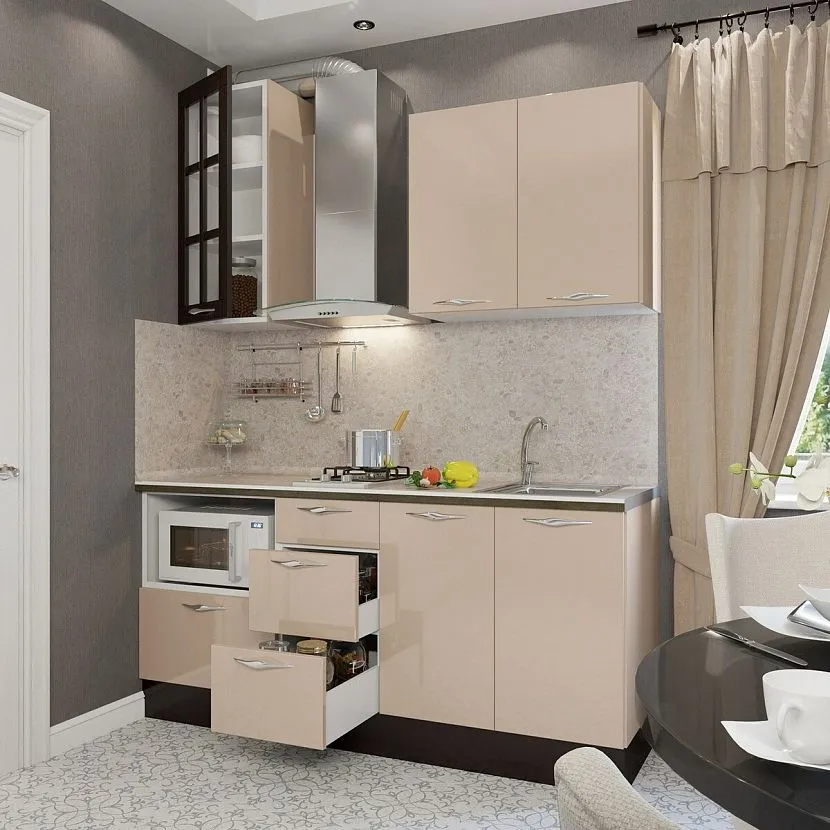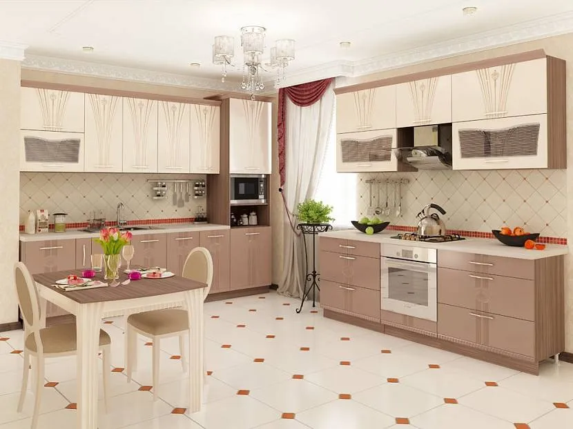 Стиль маленькой кухни в кофейном оттенке привлекает внимание. Молочно-бежевый фасад отлично сочетается с кафелем, имеющим интересный орнамент на полу