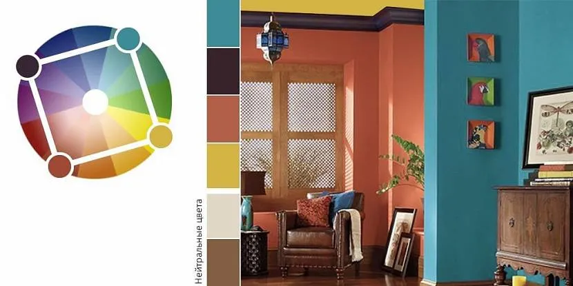 Схема при контрастной тетраде (квадрат). Служит основой для интересного интерьера, с большим количеством цветов. Понравится не всем. Востребован для обустройства жилья в стиле бохо, для восточных интерьеров.