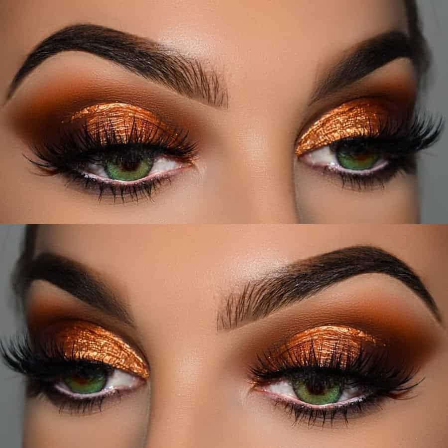 - Другим вариантом вечернего мейкапа следует указать использование теней с металлическим блеском, а также средств медных и золотых цветов.