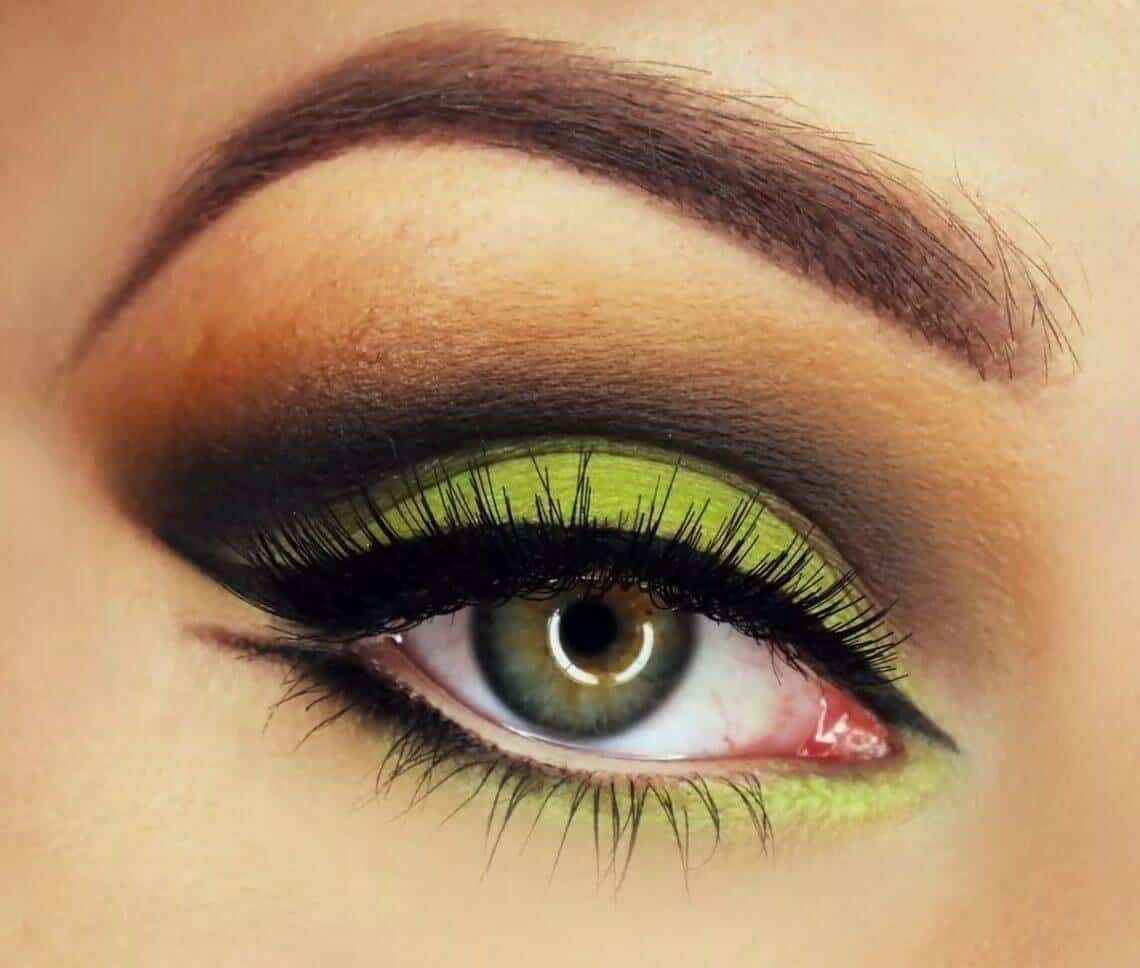 Растяните чёрный карандаш на всё верхнее веко: он будет служить подложкой. На центральную часть подвижного века пойдёт зелёный пигмент. Угол мы подсветим светло-зелёным оттенком из палитры. Для нижнего века можно взять тёмно-зелёный цвет или же любой контрастный тон – розовый, бордовый, сливовый.