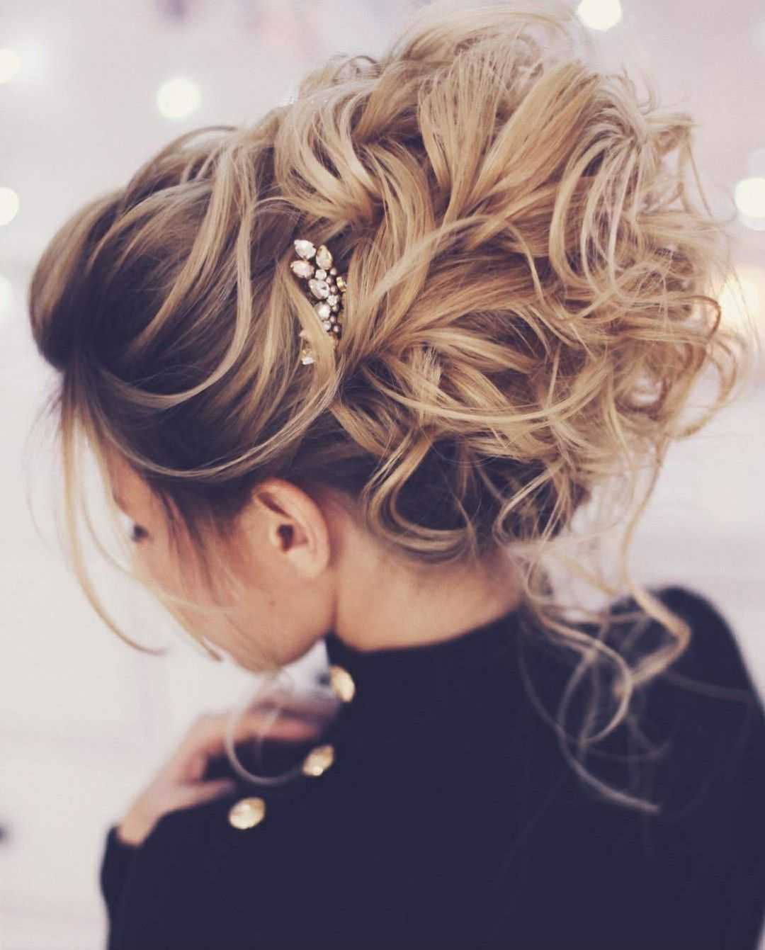 Красивый пучок на длинные волнистые волосы — часть повседневного или праздничного образа, которая хорошо смотрится как в нижней части головы, так и сверху. Однако придется обзавестись пенкой, чтобы сделать пряди послушными. Если они слишком сильно вьются, можно упростить себе работу и разделить большой хвост на маленькие, чтобы фиксировать заколками было удобнее.