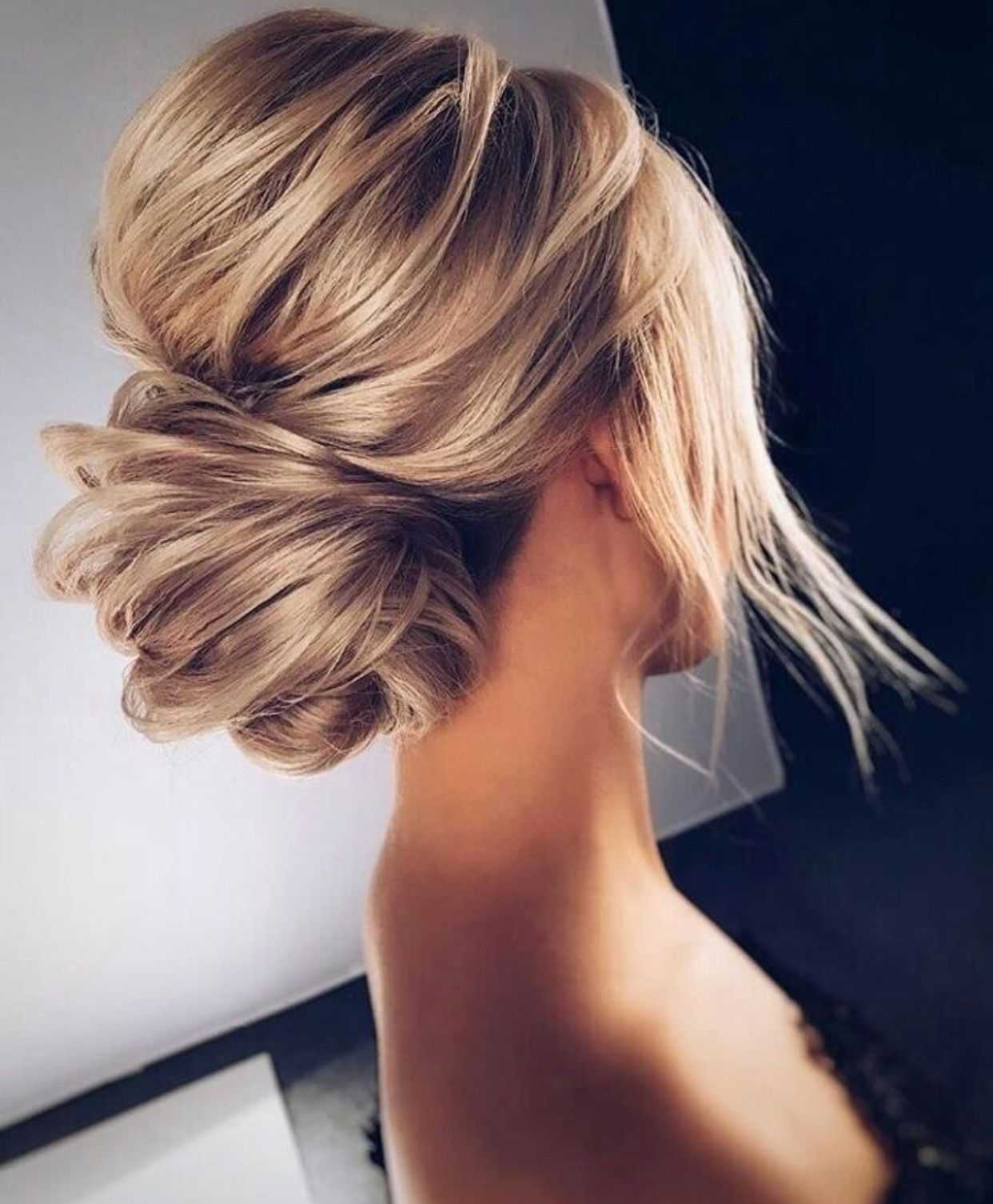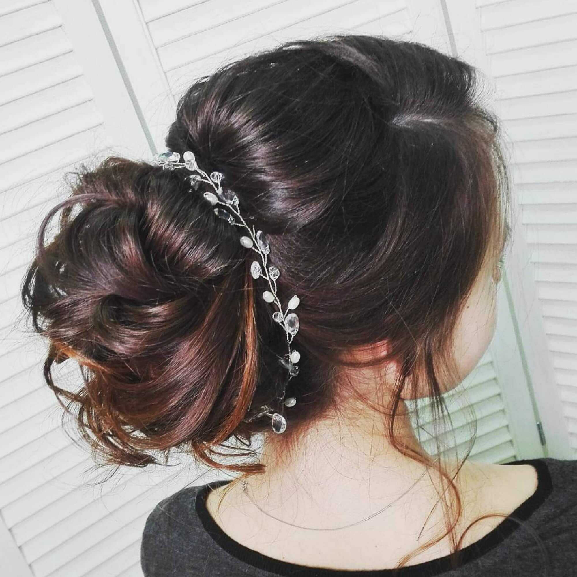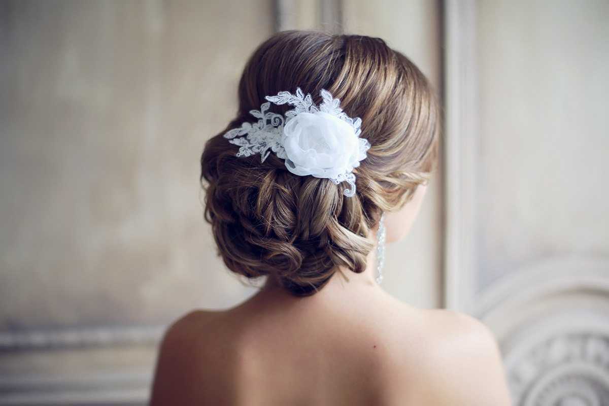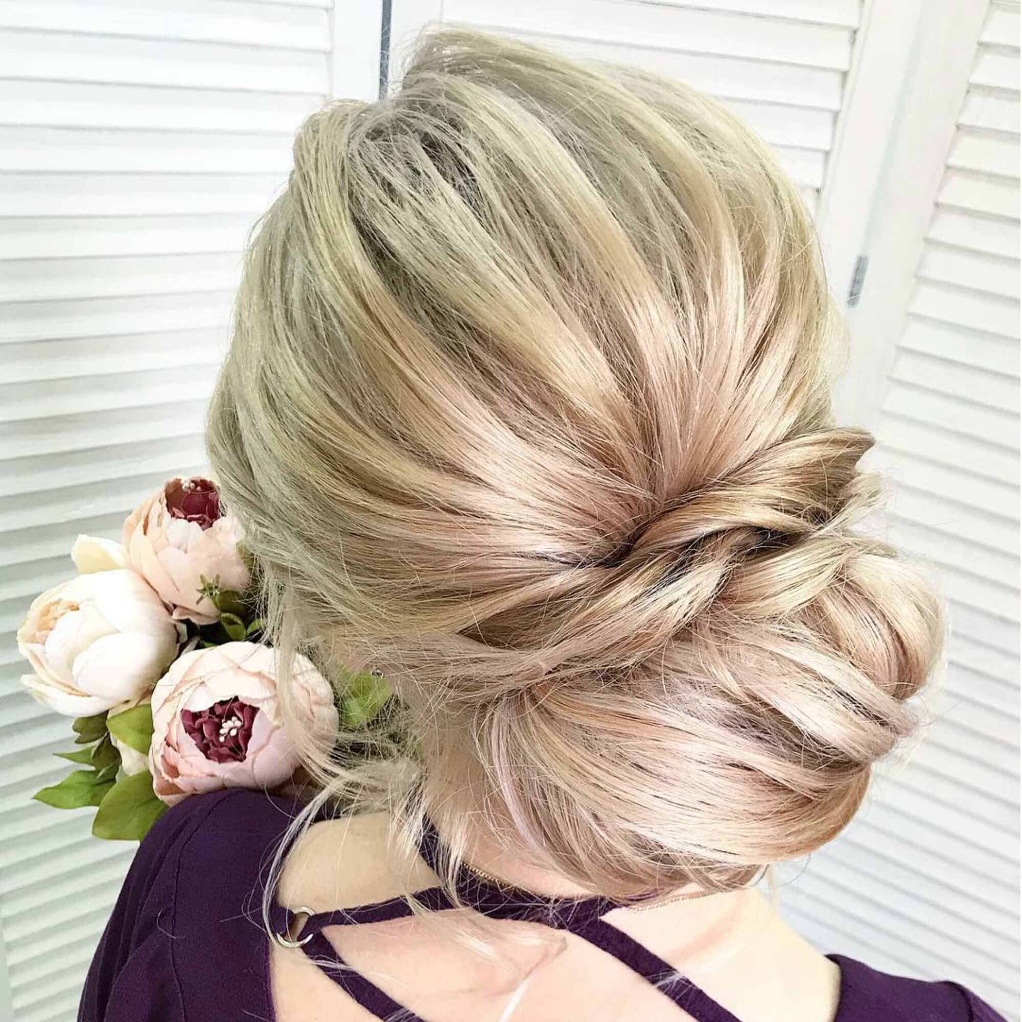 Пучок в небрежной технике исполнения позволит сделать образ чуть более расслабленным. Такой вариант наиболее часто выбирают в том случае, если платье летящее, но в то же время элегантное. Для создания такой прически чаще всего волосы завивают на крупные локоны. Это нужно для того, чтобы она получилась более объемной и воздушной. После чего волосы собирают в пучок, вытягивая несколько прядей у лица и сбоку. Такие детали всегда придают образу романтичности. При желании можно добавить небольшие украшения со стразами или бусинами. Это будет уместно в том случае, если на платье отсутствует дополнительный декор. Нередко прическу украшают специальными декоративными цветами небольшого размера. Благодаря таким деталям образ невесты становится еще более утонченным.