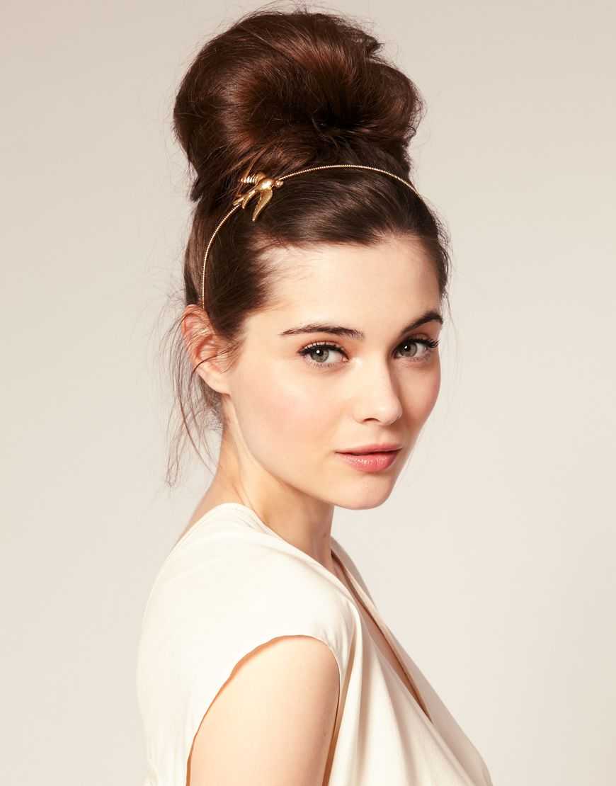 Красивый, небрежный пучок на средние или короткие волосы подходит на день рождения, свадьбу или другой праздник. Отличительные особенности — асимметричность и легкость. Для создания используется лента или ободок. Лента помещается на затылочную часть, каждая прядь оборачивается вокруг нее и в конце фиксируется заколкой. Небрежный пучок на средние волосы своими руками делается с парой прядей спереди. Они должны небрежно свисать у висков. Можно слегка завить их.