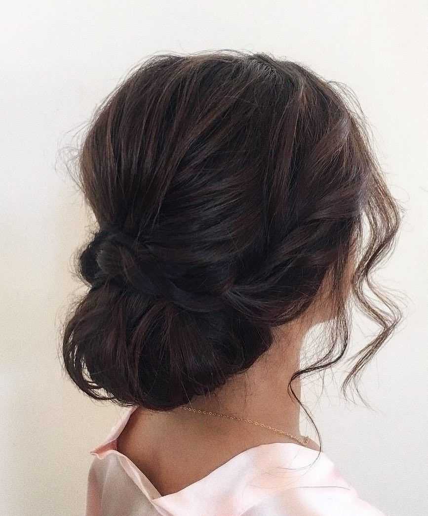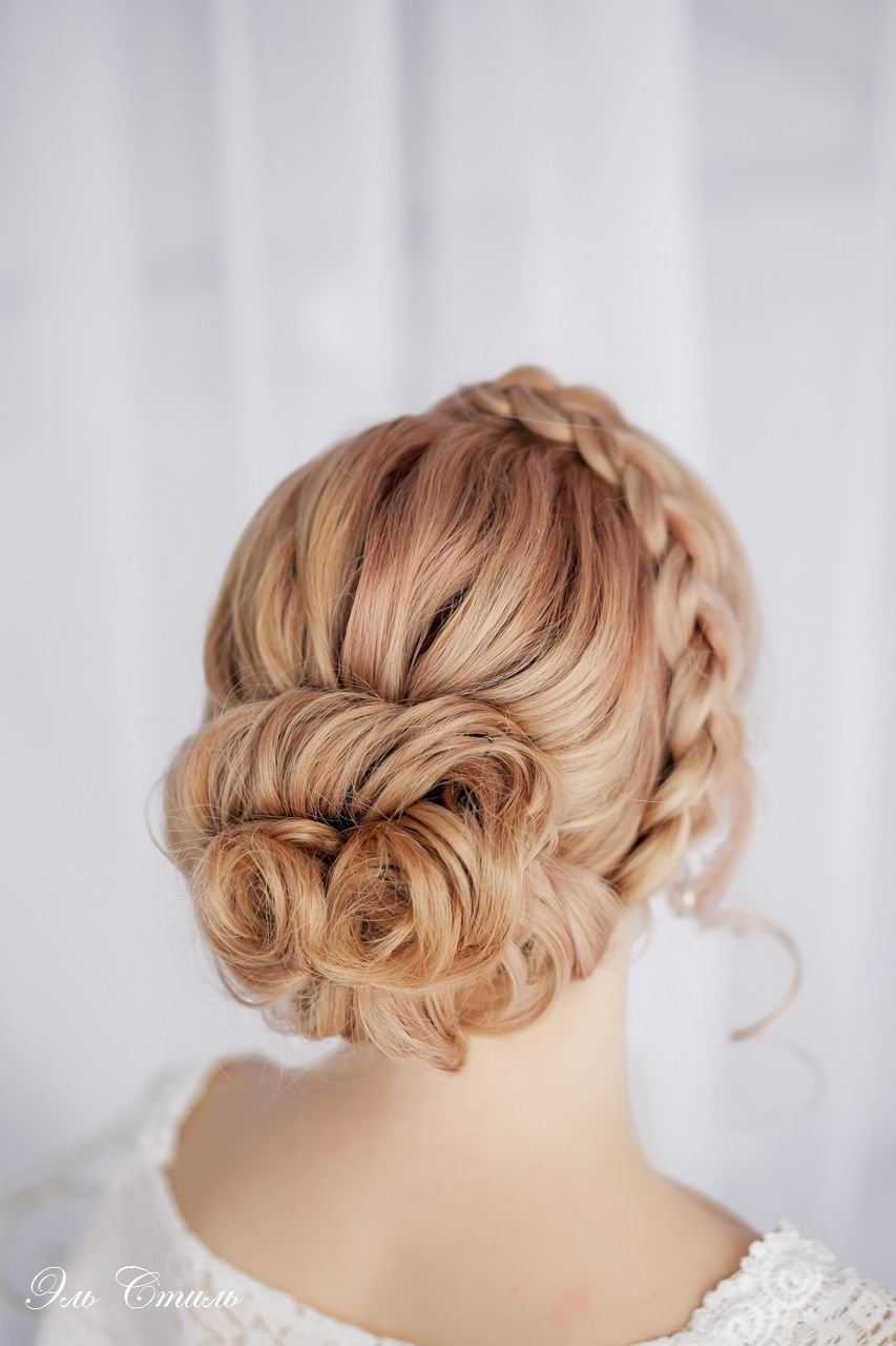 - Низкий пучок, который дополнен боковой косой, подойдет для образа невесты и для любых платьев.