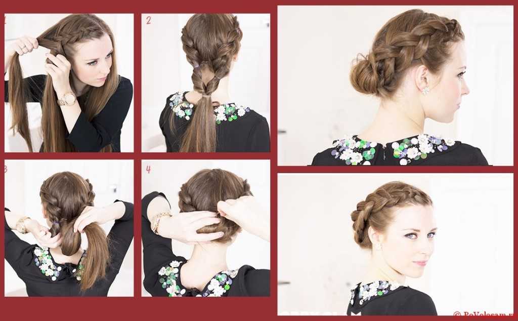 Густые длинные волосы собери в хвост средней высоты, раздели на пряди и заплети их в косы. Подними косы наверх, расправь бублик, а сверху спрячь концы за крупной заколкой.