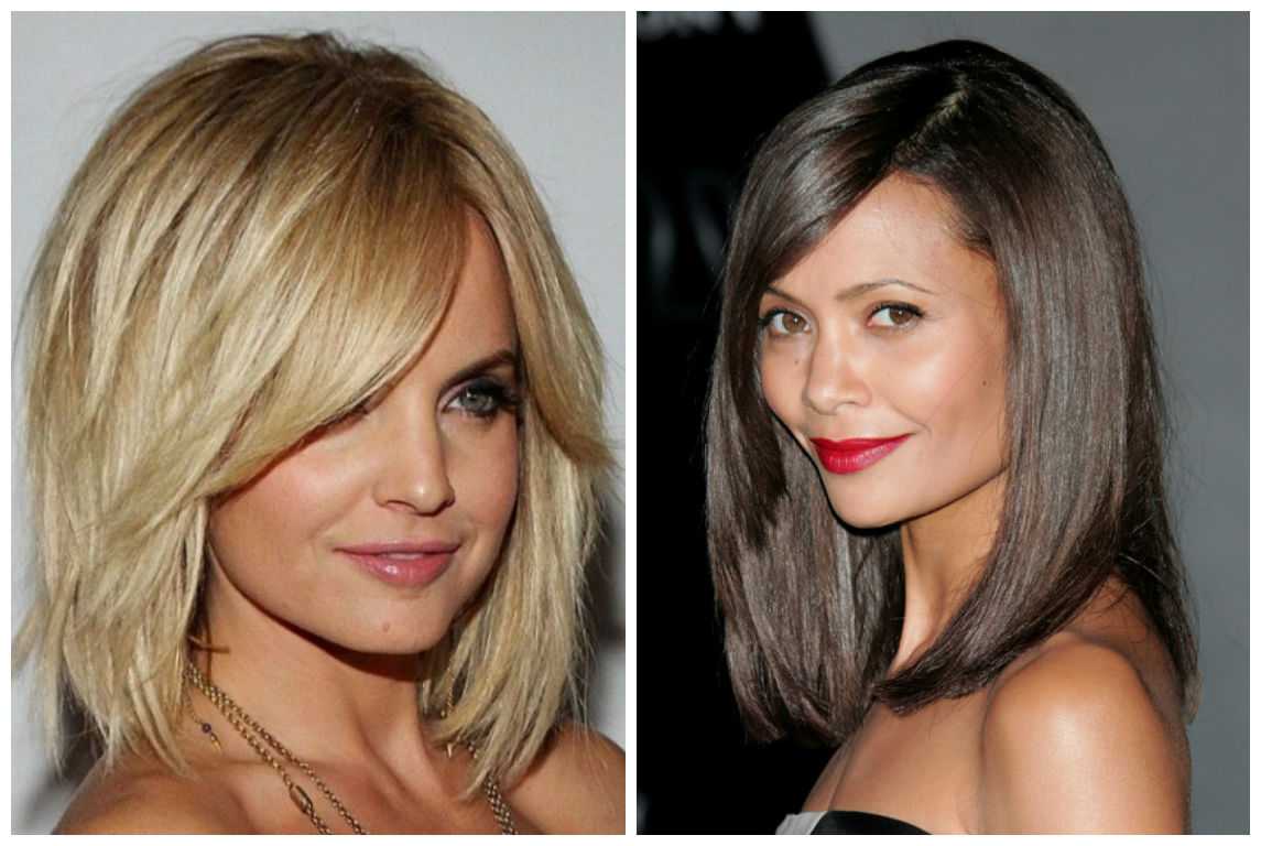 На темные, русые пряди и для правильной, овальной формы лица подойдут любого типа подстрижки с косой челкой (и с короткой, и с длинной).