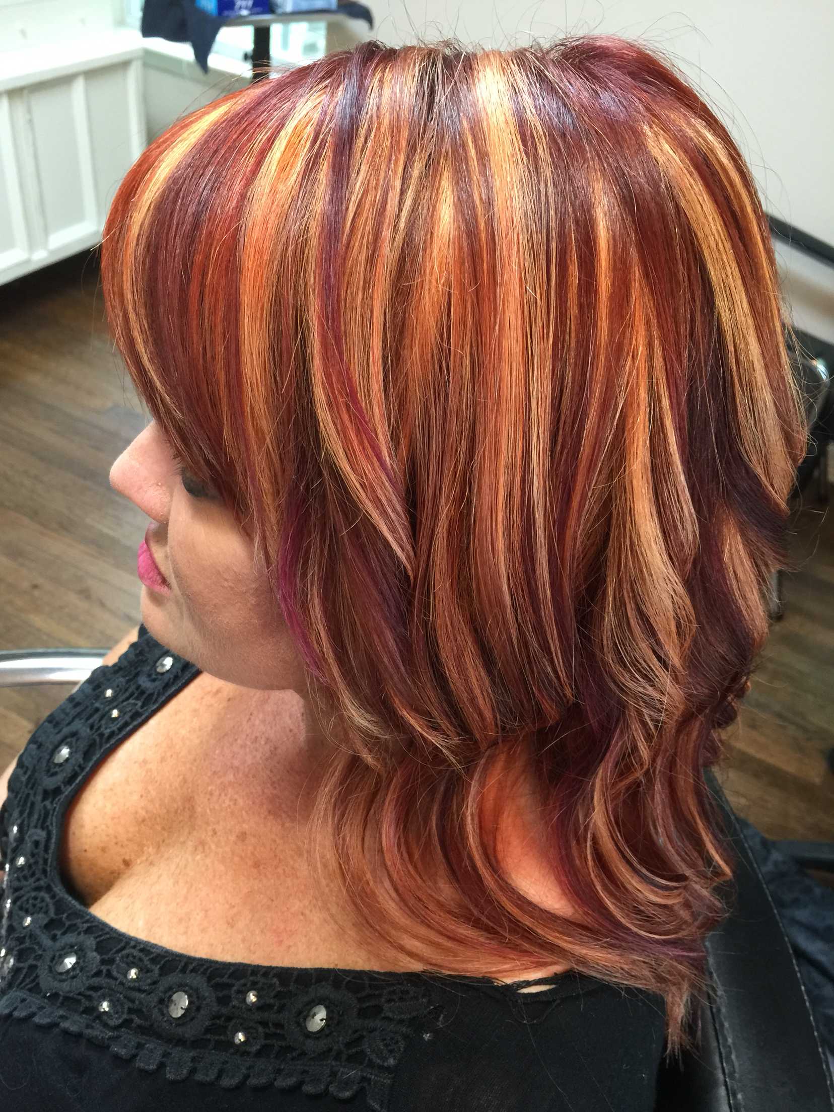 Когда волосы до плеч или чуть ниже, можно также использовать разные техники мелирования. Например, обладательницам рыжей шевелюры подойдёт как классическое частое окрашивание, так и что-то более экстравагантное.