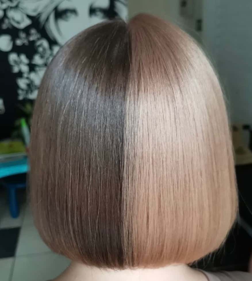 - осветление. Способ рекомендован в случае, если волосы изначально прочные и неповрежденные. В рамках техники сначала выполняется дополнительное осветление всех волос, и только после этого наносится итоговый цвет. Тогда минимизируется вероятность проявления рыжины;