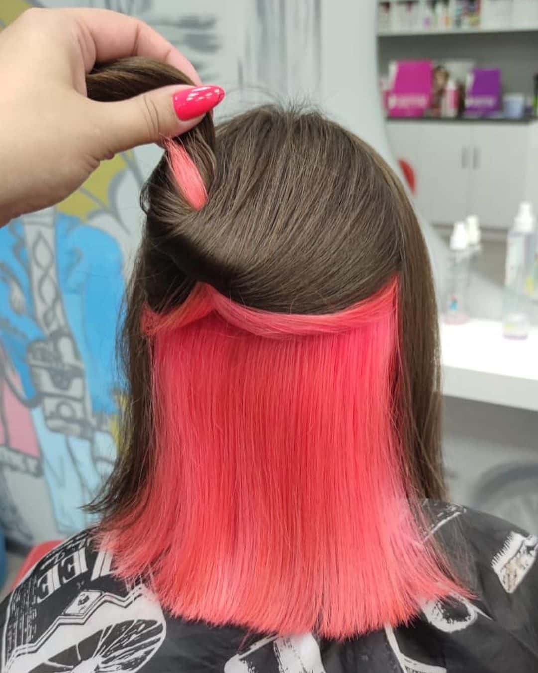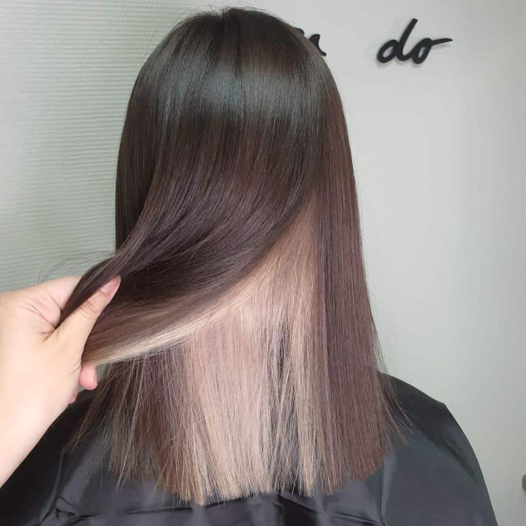 Радикальное и одновременно скрытое окрашивания волос в коричневый может менять образ, в зависимости от пробора, давая видимость цвета.