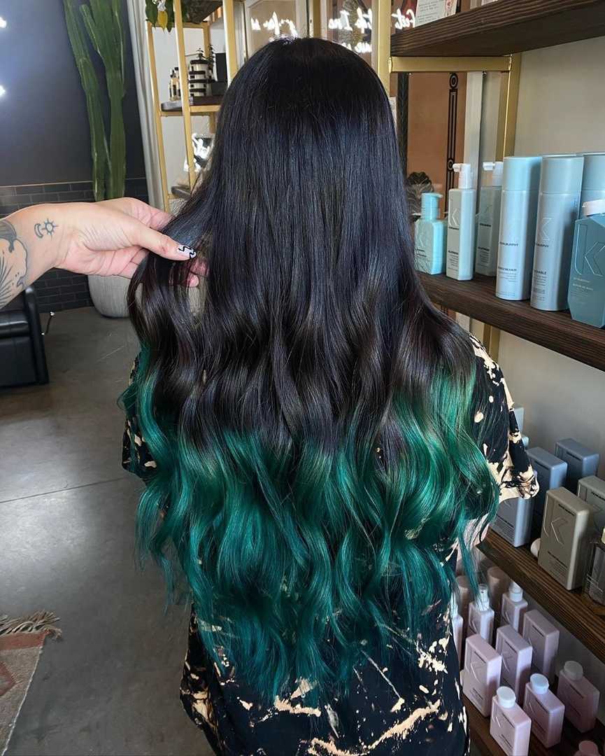 Тем, кто желает, чтобы на их прическу обратили внимание, рекомендуем сделать покраску с эффектом радуги, например, плавный переход каштановых корней в зеленые или синие кончики. Промежуточным может быть любой цвет – розовый, бордовый, желтый
