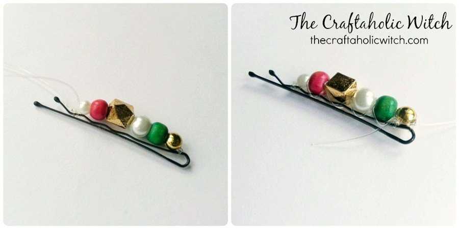 - Продолжайте привязывать бусины к металлу, пока не дойдете до другого края невидимки. Достигнув края, завяжите два тугих узла и нанесите на них каплю суперклея. Это уж наверняка зафиксирует нити крепко.