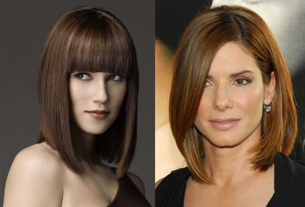 Обладательницам подобного овала стоит выбирать между удлиненной и профилированной челкой. Также с квадратом гармонизируют стрижки длиной ниже плеч. Ровная челка или прически, достигающие подбородка, нежелательны.