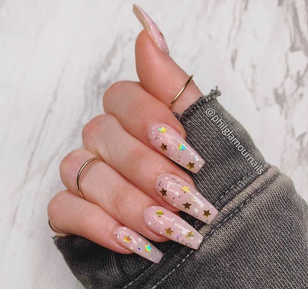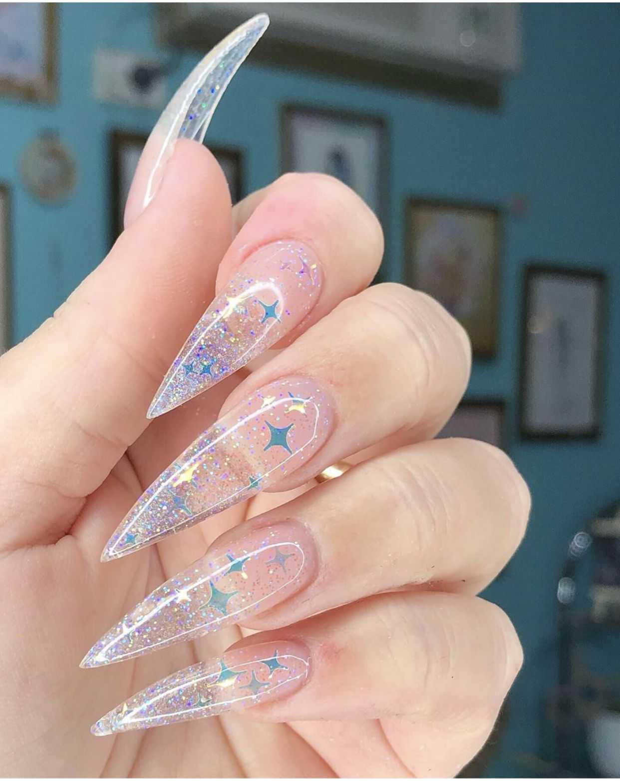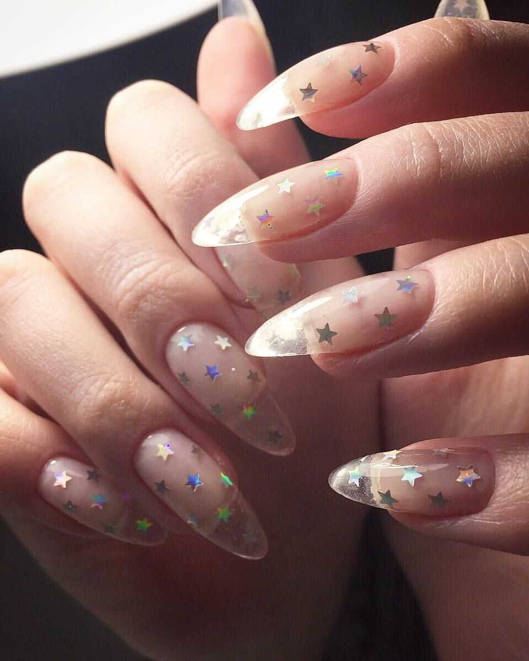 Блестки могут использоваться как самостоятельные, так и дополнительные декоративные элементы. Разная их величина, цвет, форма могут создать желаемый эффект и при этом не потребуют большой толщины наносимого сверху гель-лака.