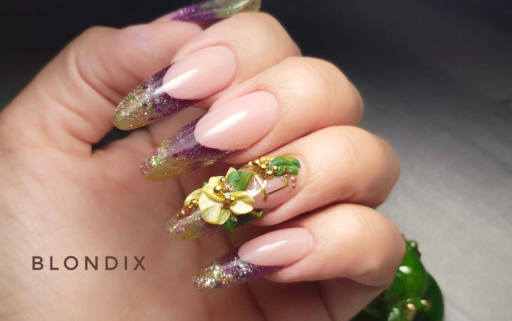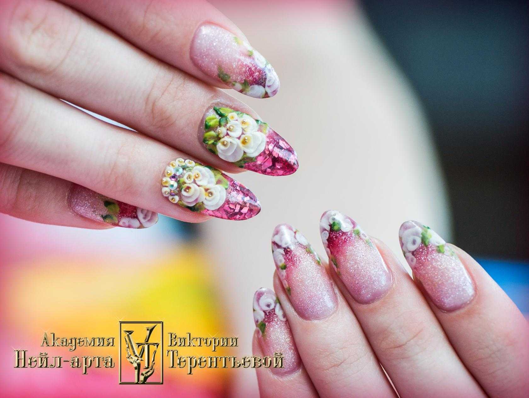 - Далее можно смело проявлять свои творческие способности: сделайте блестящую подфоновку контрастной пудрой, с помощью белой и розовой краски изобразите цветы, узоры, орнаменты. При более сложном исполнении аквариумный дизайн для наращенных ногтей предусматривает объемную лепку, что не очень практично в быту, но весьма эффектно смотрится с праздничным нарядом. Не бойтесь экспериментировать: добавляйте золотые блестки, глиттер, металлизированную фольгу, контрастные акценты, бусины и бантики. Главное, не переборщите с декором. Чем более изящными будут ваши линии и увереннее мазки, тем эффектнее получится аквадизайн ногтей.