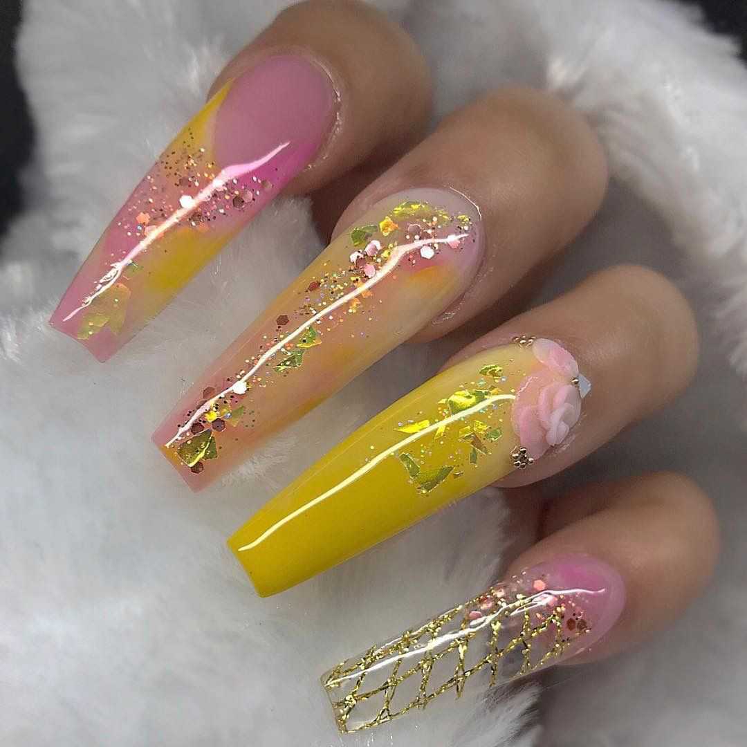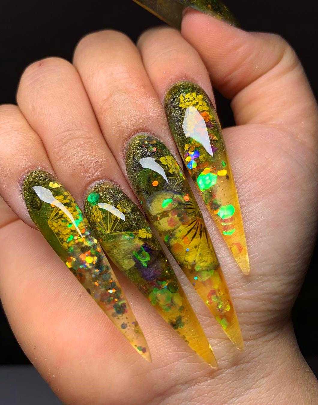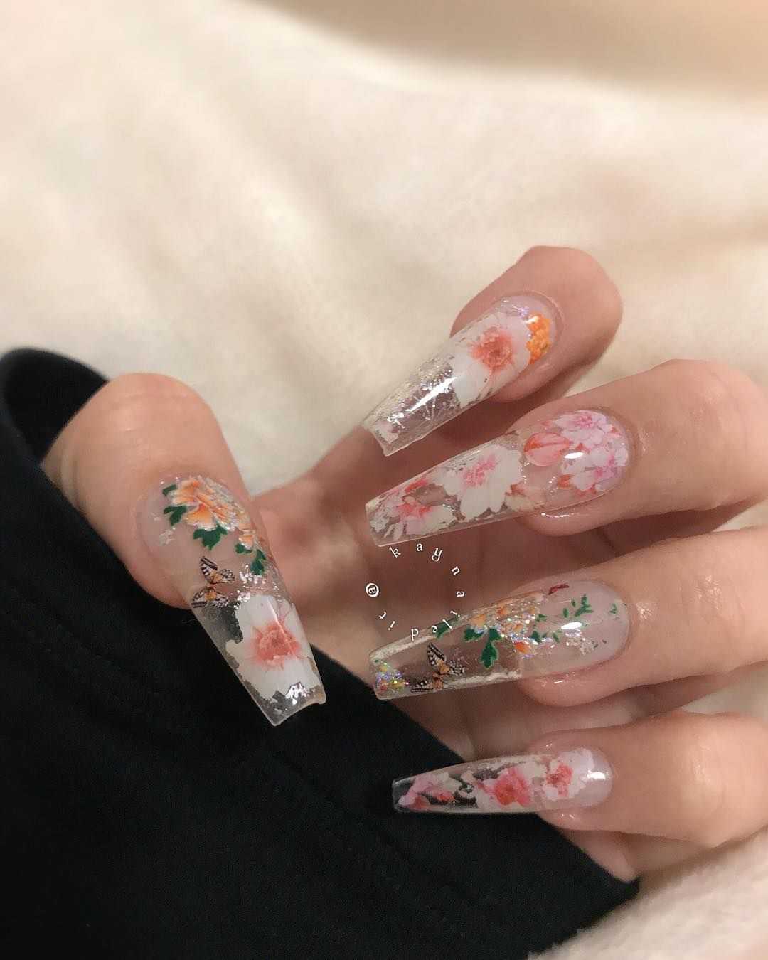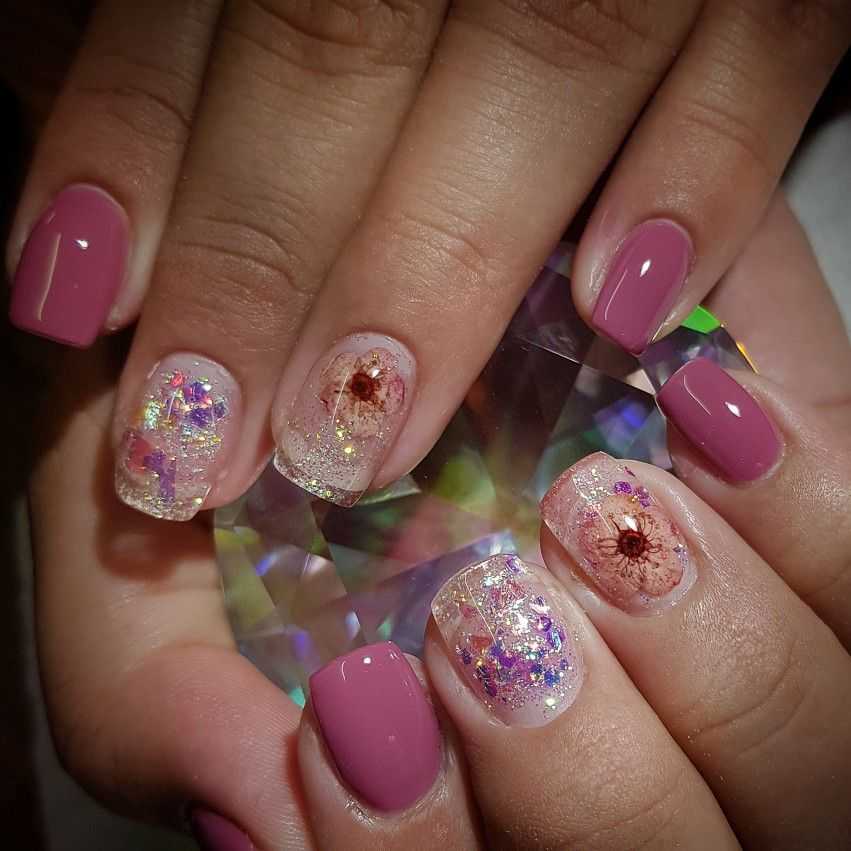 Если скомбинировать цветы и блестки, сможете создать неповторимый нейл-арт, который будет уместно смотреться на вечеринках и торжествах. Вместо классических стразов воспользуйтесь камнями или хрустальной крошкой.