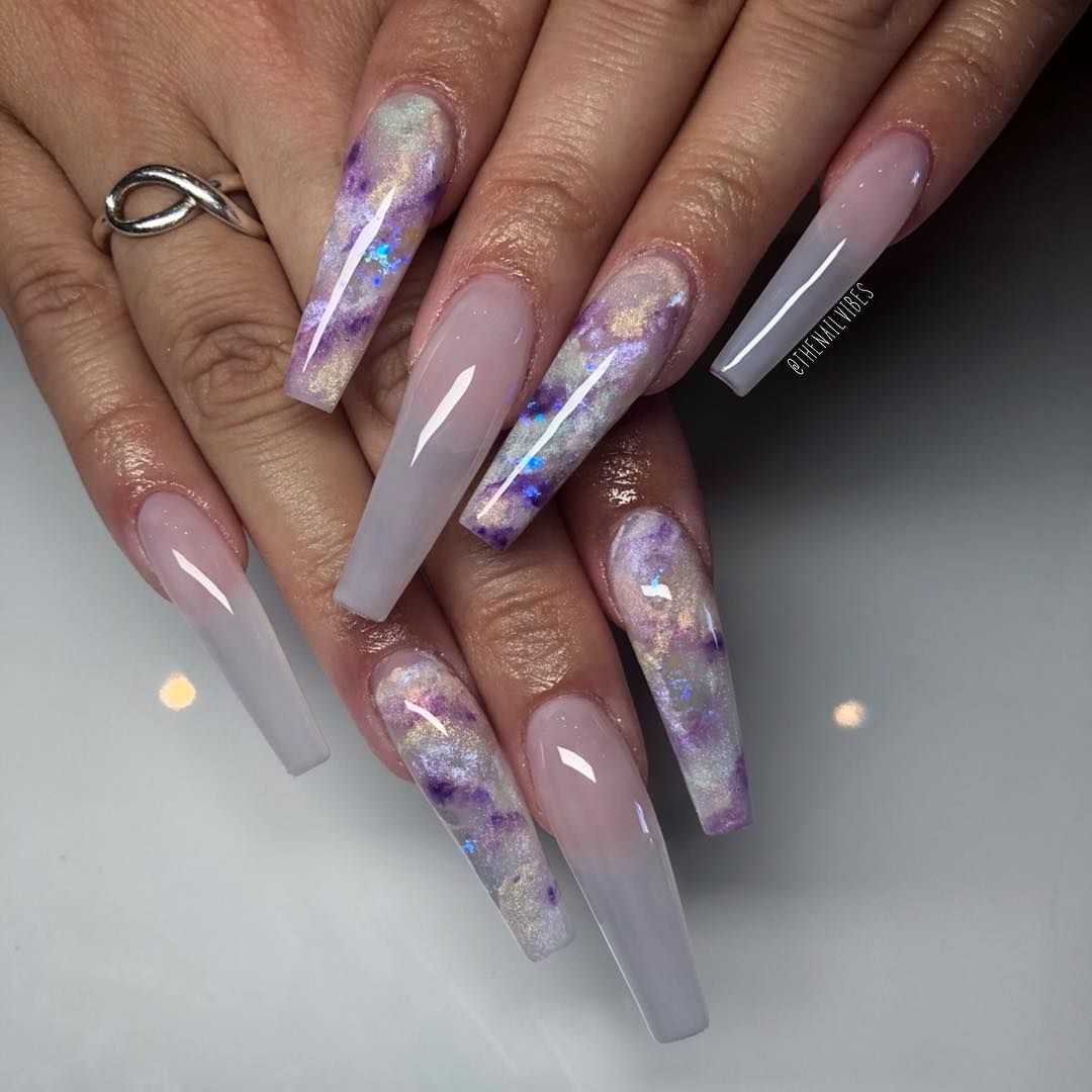 Техника аква-маникюра идеально подходит для создания на ноготках мраморного узора. Его еще называют пенными разводами.
