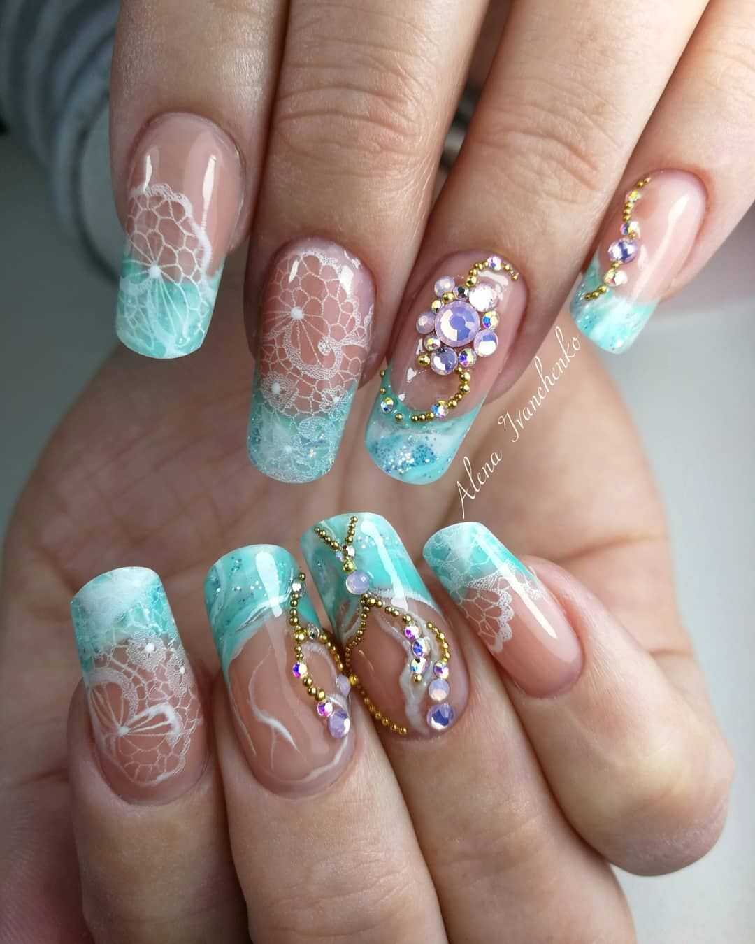 Применить настоящие кружева в маникюре возможно, если работать в технике «аквариума». Кусочки тканого материала допустимо использовать как на всех ноготках, так и выборочно, дополняя их стразами, блестками и другими сопутствующими украшениями. Для натуральных ногтей лучше выбирать ультра тонкое кружево или вовсе найти альтернативу в виде стемпинга, наклеек и т.п.