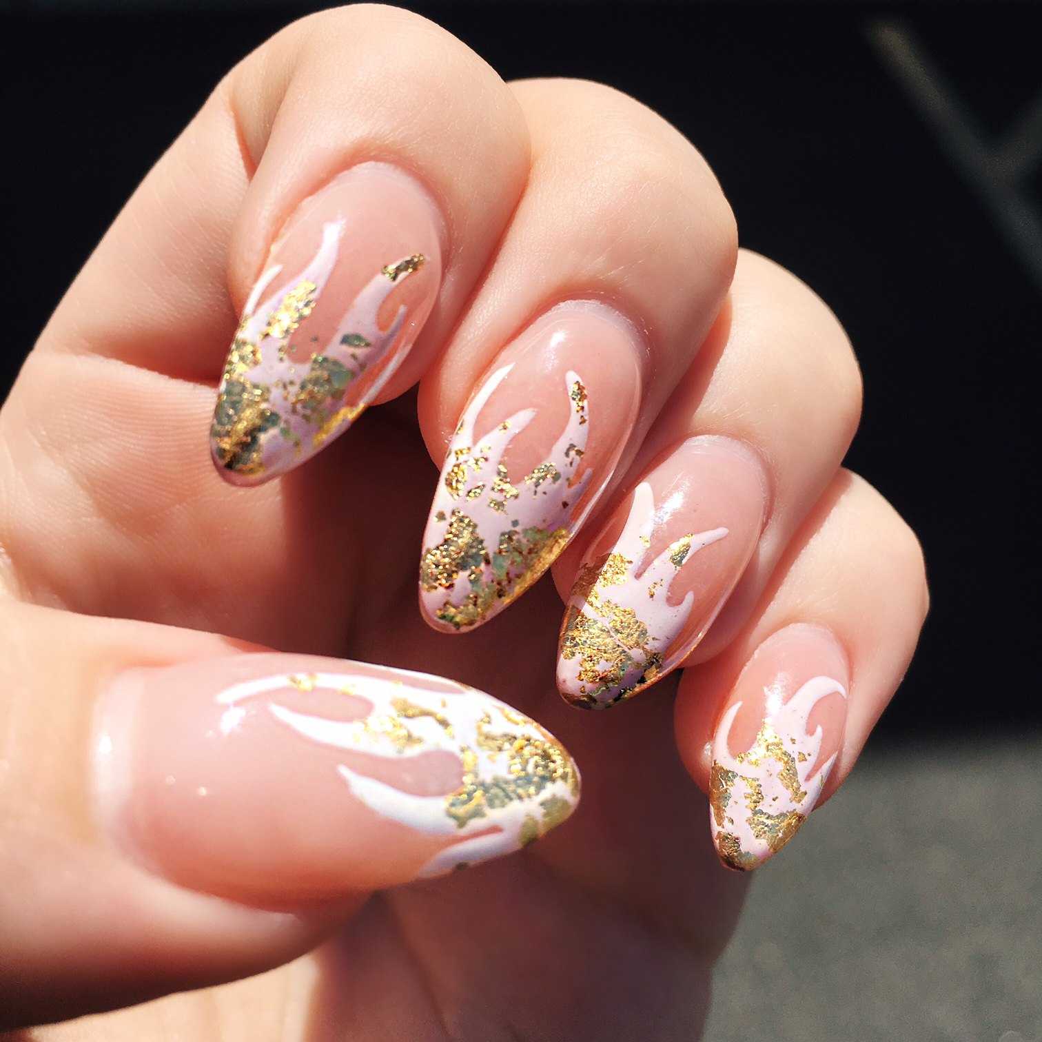 Идеальный материал в создании янтарного френча. Маникюрная фольга свободно продается в магазинах, стоит недорого. Вместе с ней можно в декоре часто используется акриловая пудра, оформляет ею поверхность только что наращенную пластину ногтя вместе с базовым покрытием.