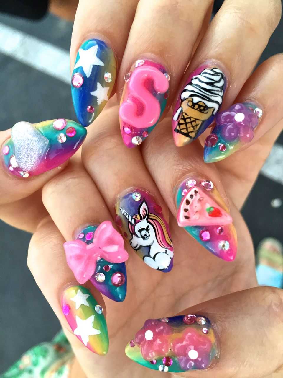 Среди украшений из акрила можно встретить разную тематику: ломтики фруктов, цветы, овощи, ракушки, аксессуары и пр. Использовать такой декор стоит также тематически и не смешивать их между собой. Для колорита окрашивают кончик ногтя в цвет, соответствующий тематике. К примеру, морской маникюр с ракушками можно обыграть, окрасив кончик ногтя в бирюзовый или голубой цвет.