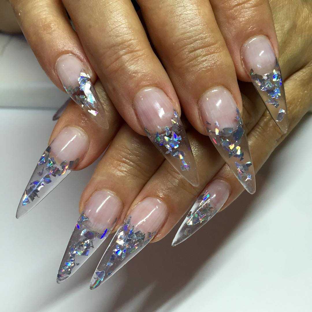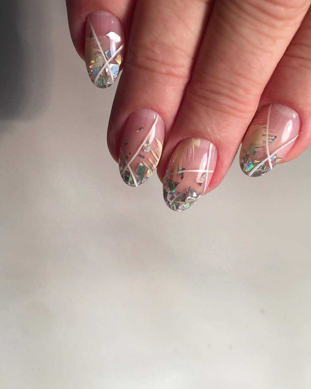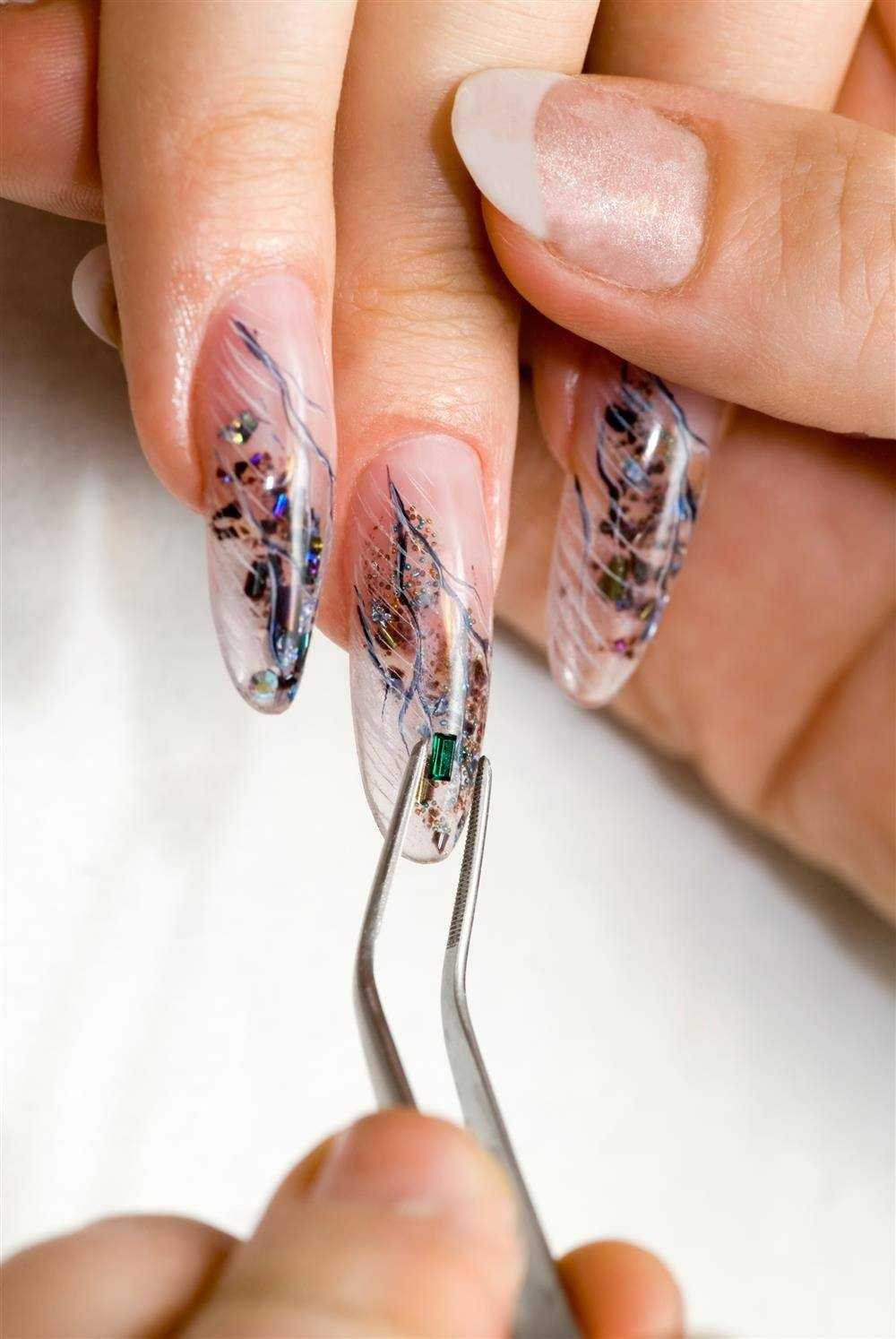 Этот декоративный прием допустим для натуральных и искусственных ноготков, так как не делает значительно толще ногтевую пластину, при этом дает великолепный блеск.