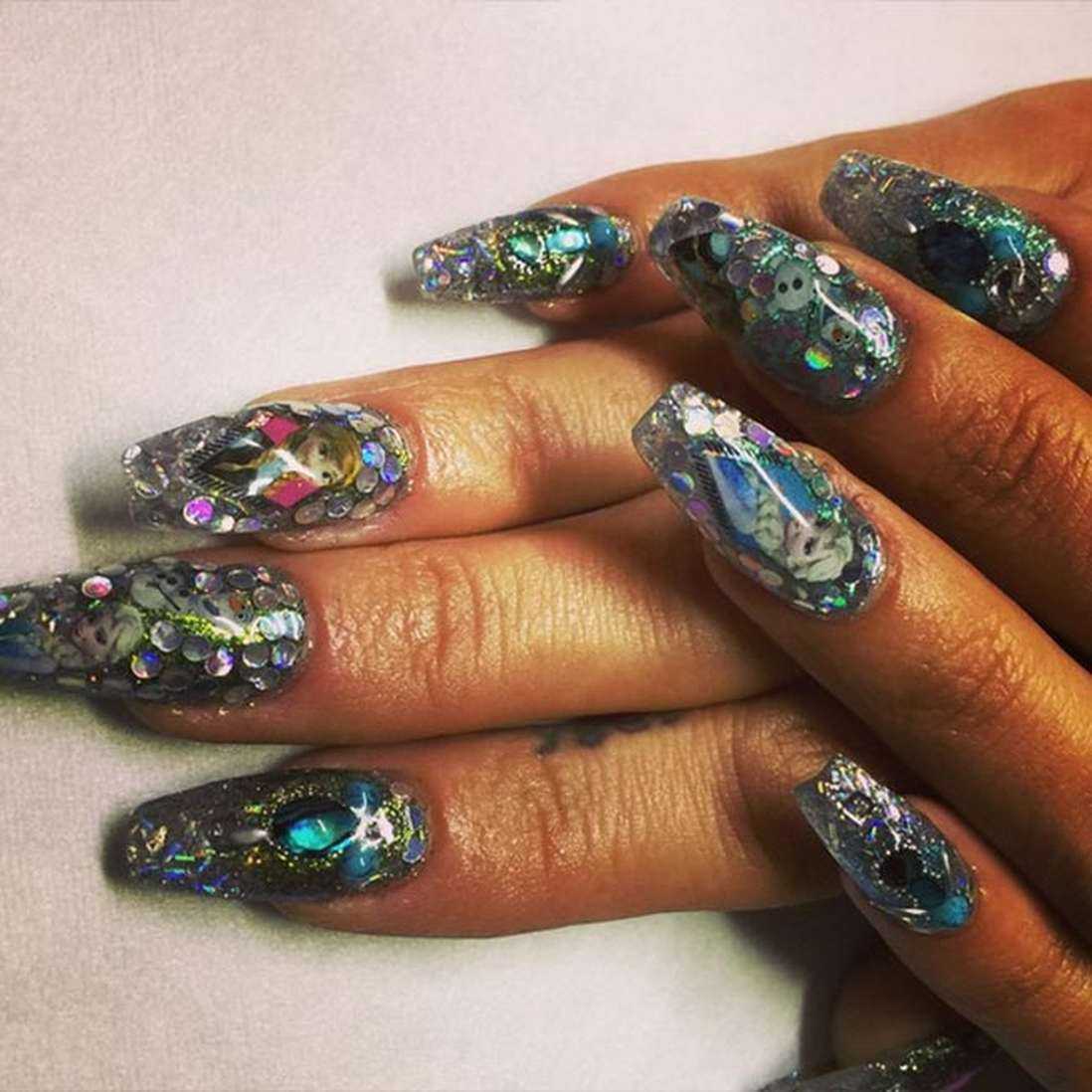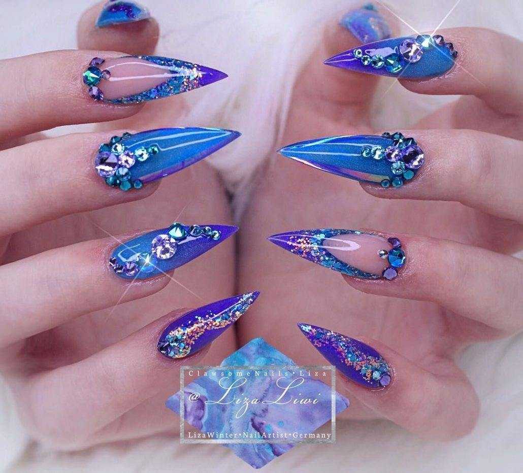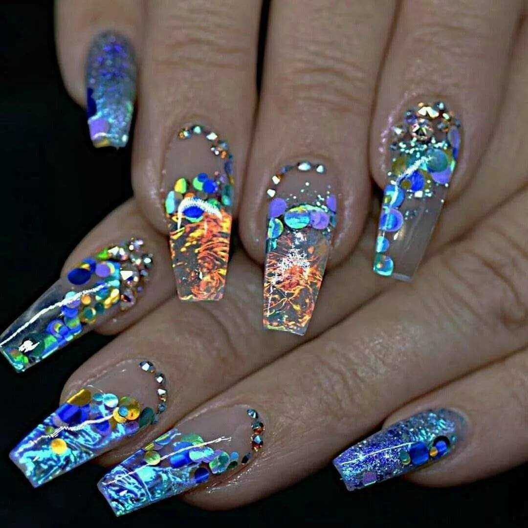 Самые популярные украшения для аквариумного маникюра – стразы и блески. Разные размеры этих элементов могут по-разному смотреться на ноготках различной длины. Для коротких натуральных ногтей лучше выбирать стразы небольшого размера, на искусственных покрытиях возможны более смелые эксперименты с величиной страз.