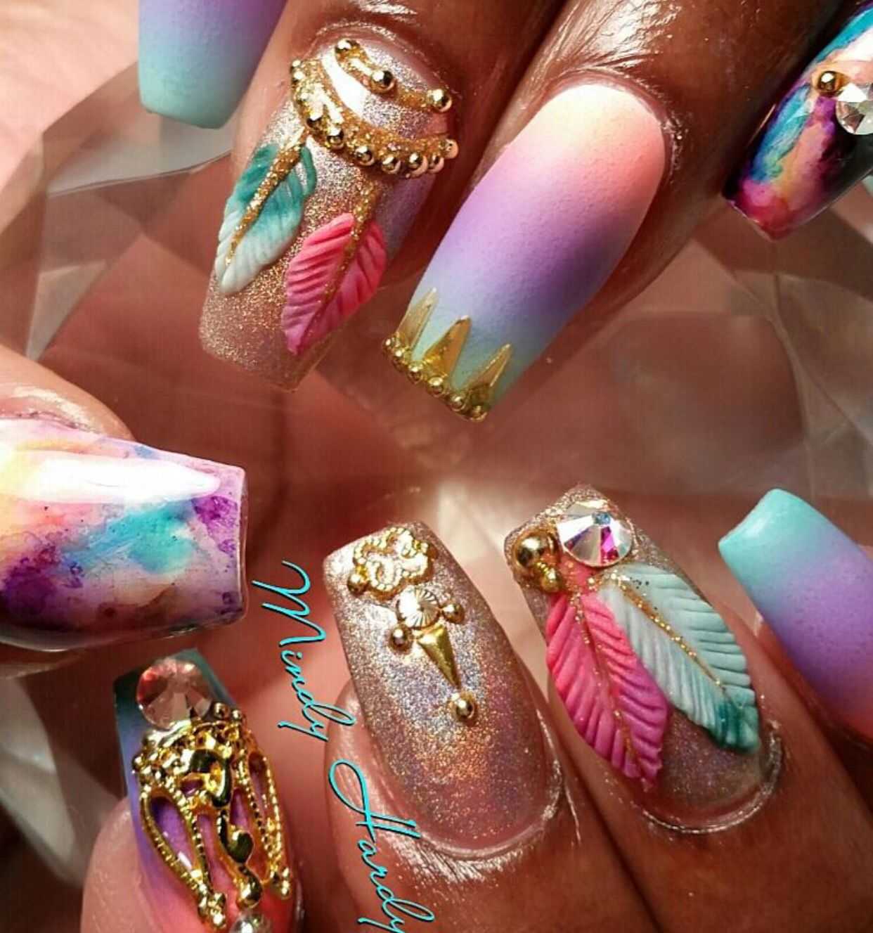Маникюр с перьями не столь популярен, но смотрится очень эффектно. Использовать перышки в дизайне удобно на искусственных ногтях. Их цвет и размер может быть разным, дополняют подобный нейл-арт блестками, прорисовками, стразами и пр.