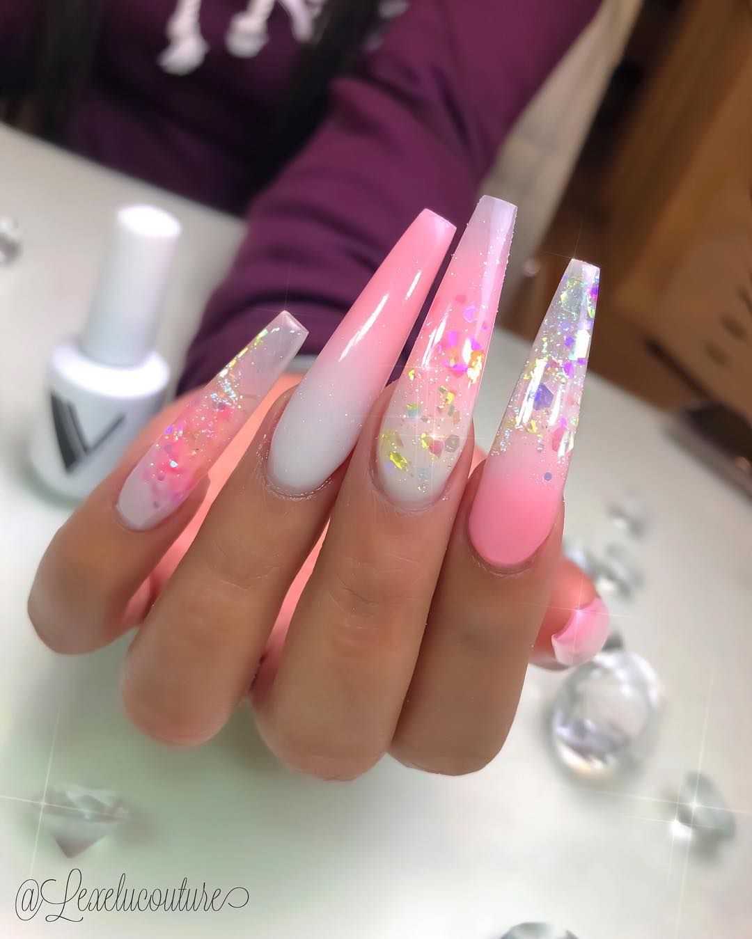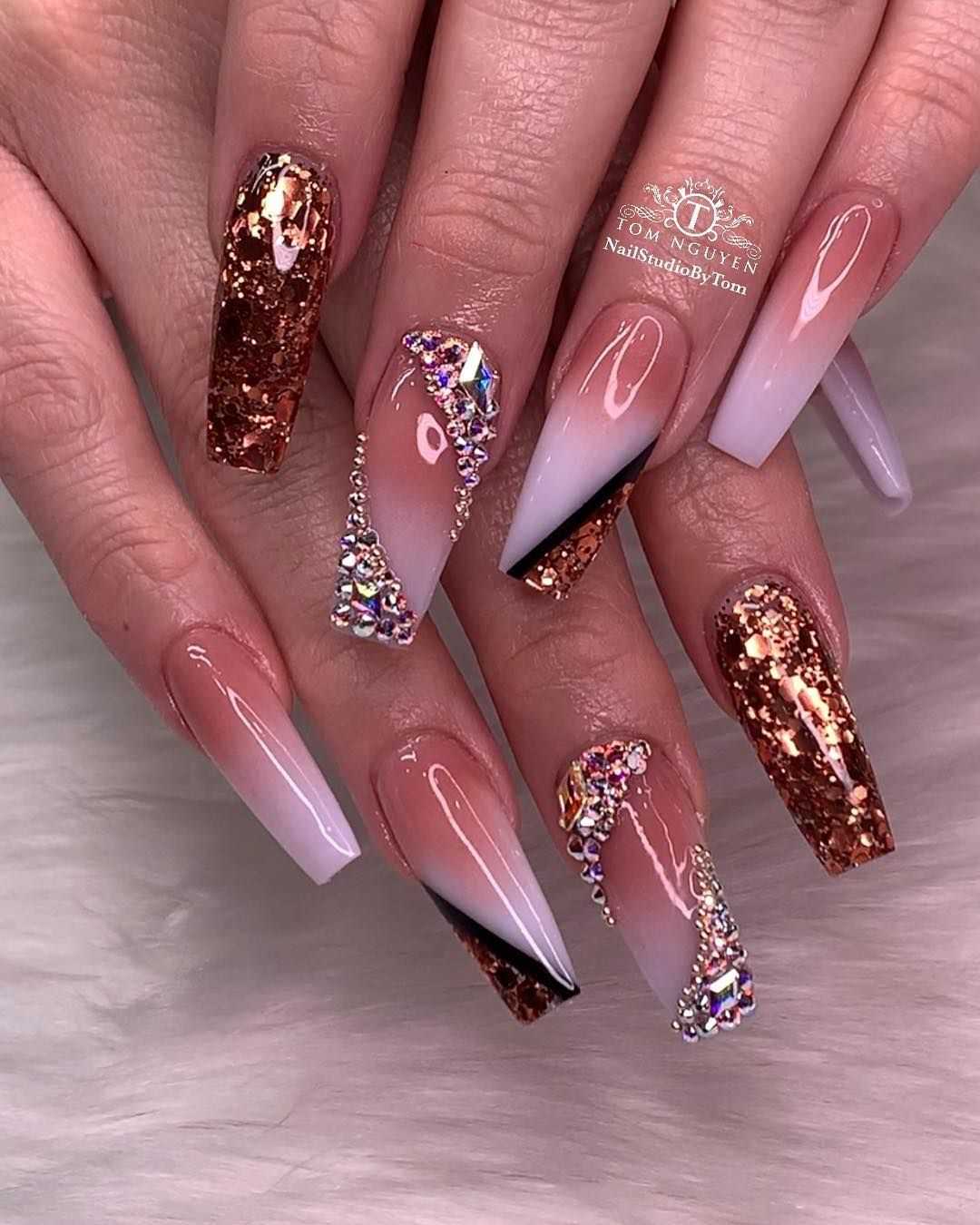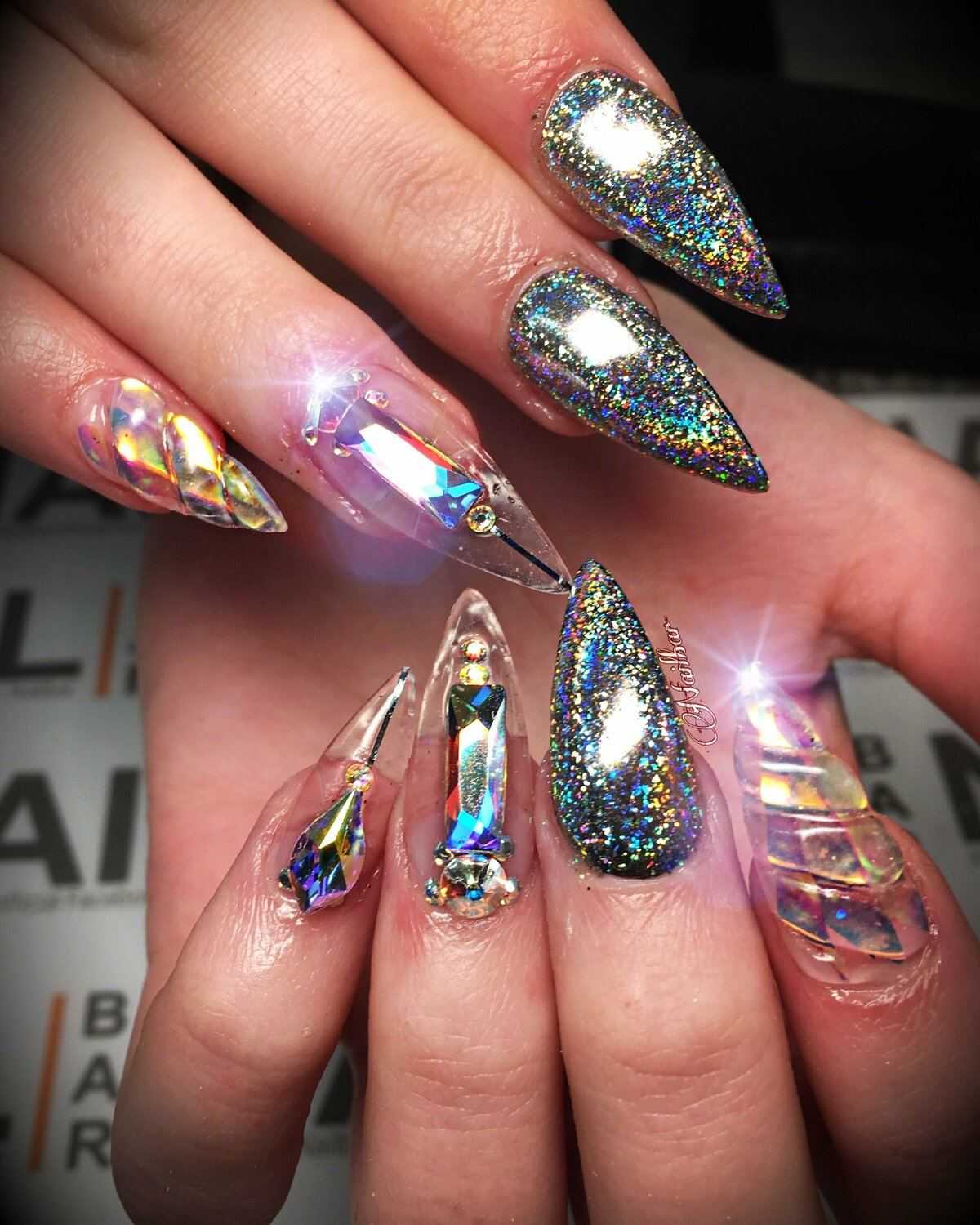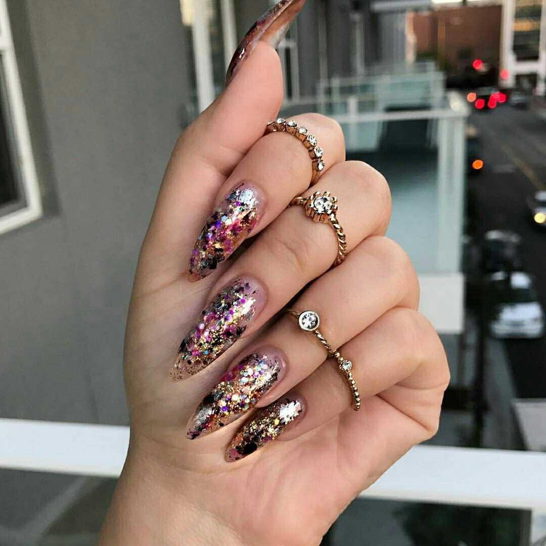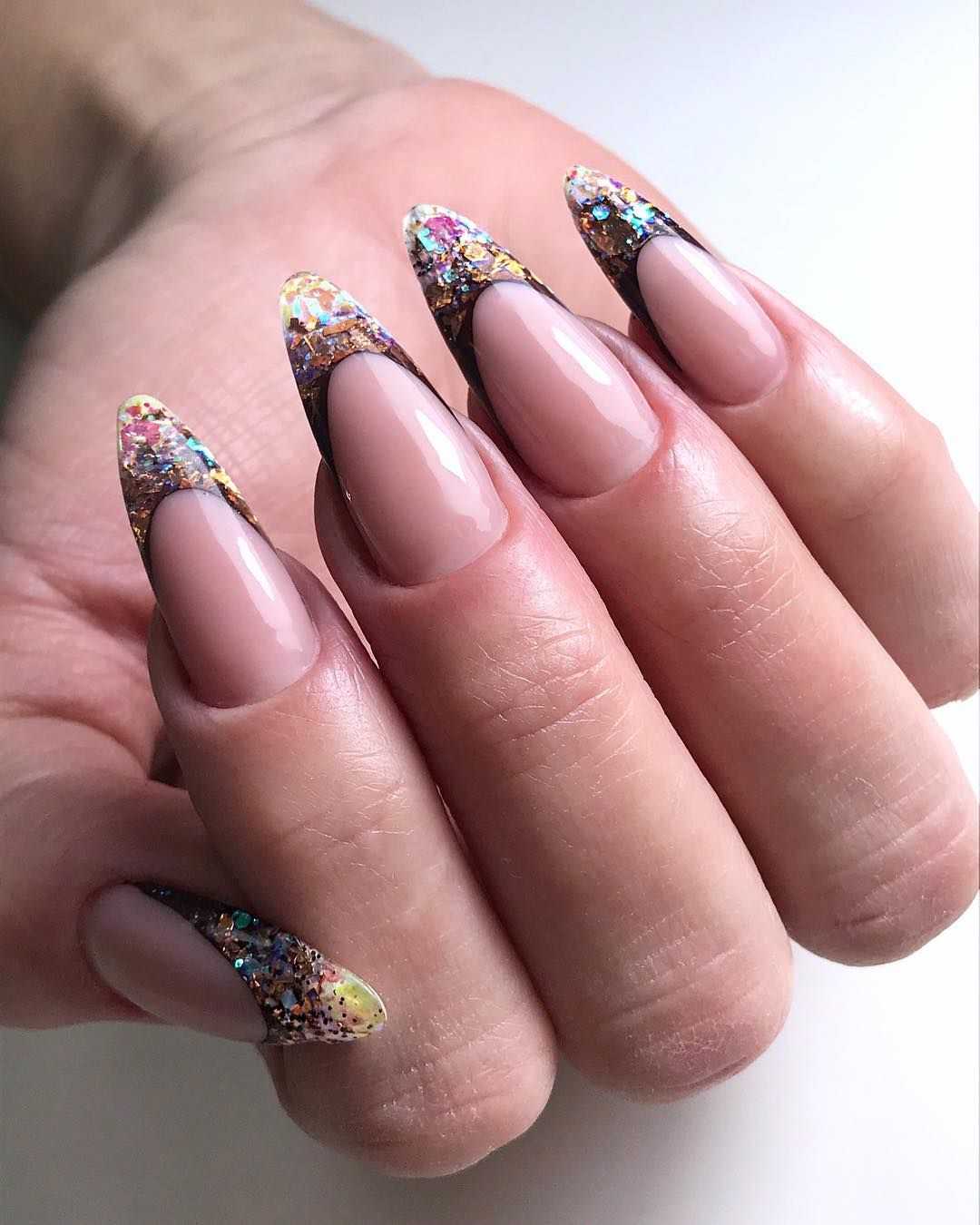 Сверкающий декор – всегда беспроигрышный вариант выбора под вечерний наряд. Ими можно украшать любую длину пластин. Глиттер можно смешивать с разными оттенками.