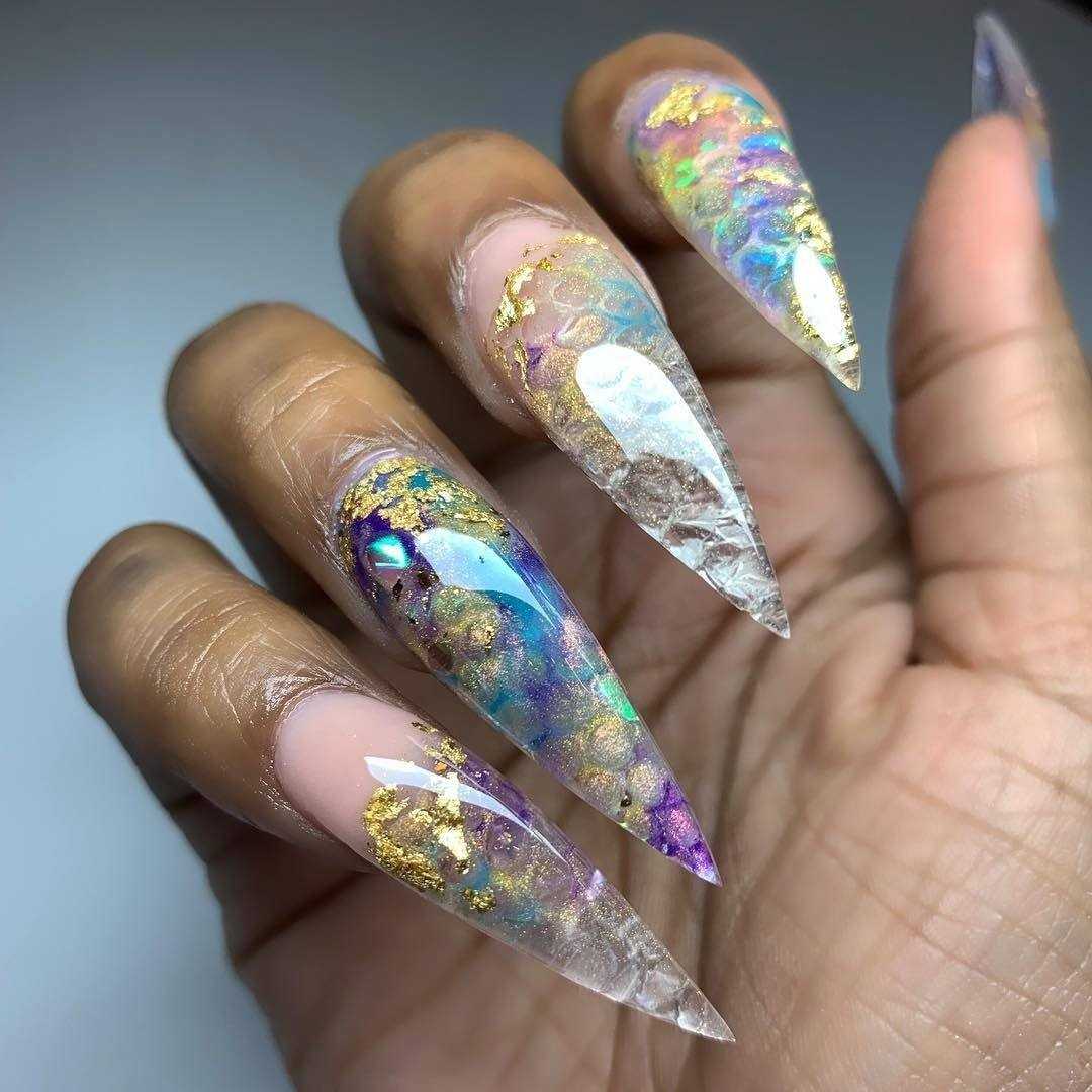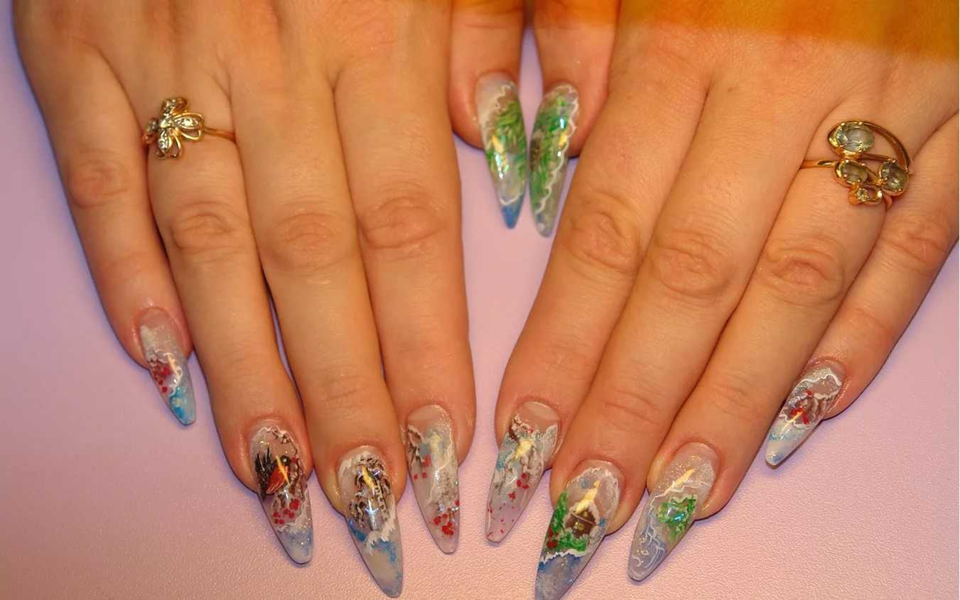 Создается аквариумный маникюр при формировании наращенного ногтя, что позволяет создавать невероятной красоты композиции, недоступные при других способах.