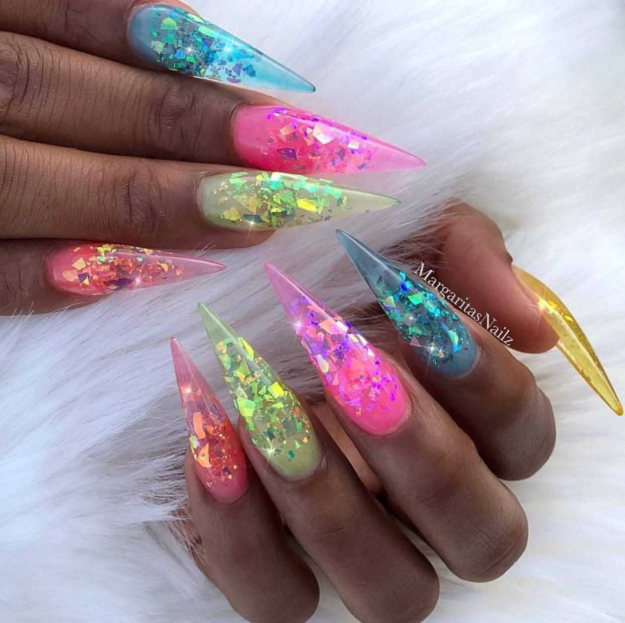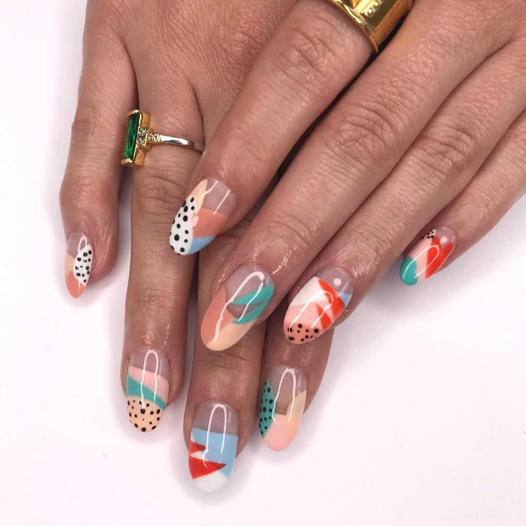 Цветные кусочки на ногтях можно зафиксировать с помощью прозрачного лака.