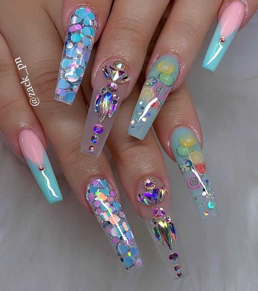 В широком перечне дизайна из акрила можно выбрать различную тематику, например, ракушки, ломтики фруктов и другие аксессуары. Для правильного колорита необходимо окрасить кончики ноготков в цвет, который соответствует выбранной тематике. Например, дизайн с применением ракушек стоит дополнить окрашенными кончиками голубого или бирюзового цвета. При использовании акриловой пудры получится очень красивый и необычный аквариумный маникюр. Такой декор прекрасно комбинируется с объемными и массивными элементами. На натуральных ноготках лучше всего избегать использование лепки, ведь при заливке декора уйдет много геля, и дизайн будет смотреться не эстетично.