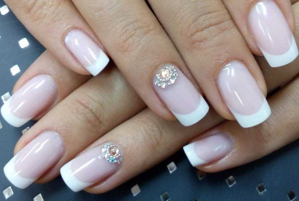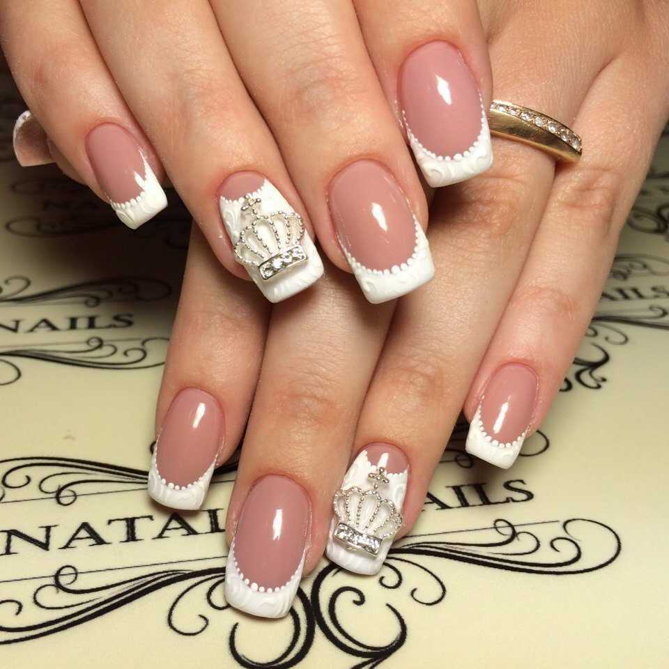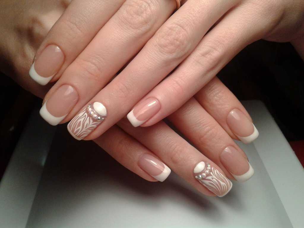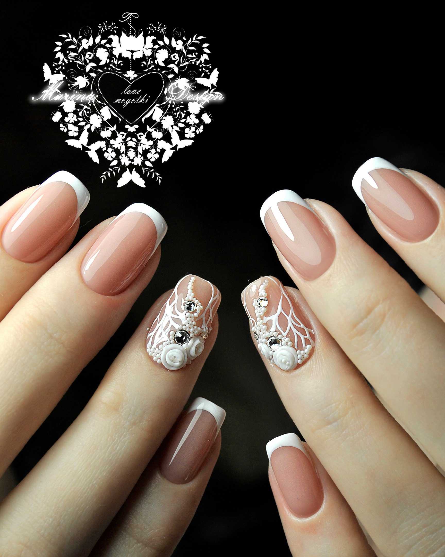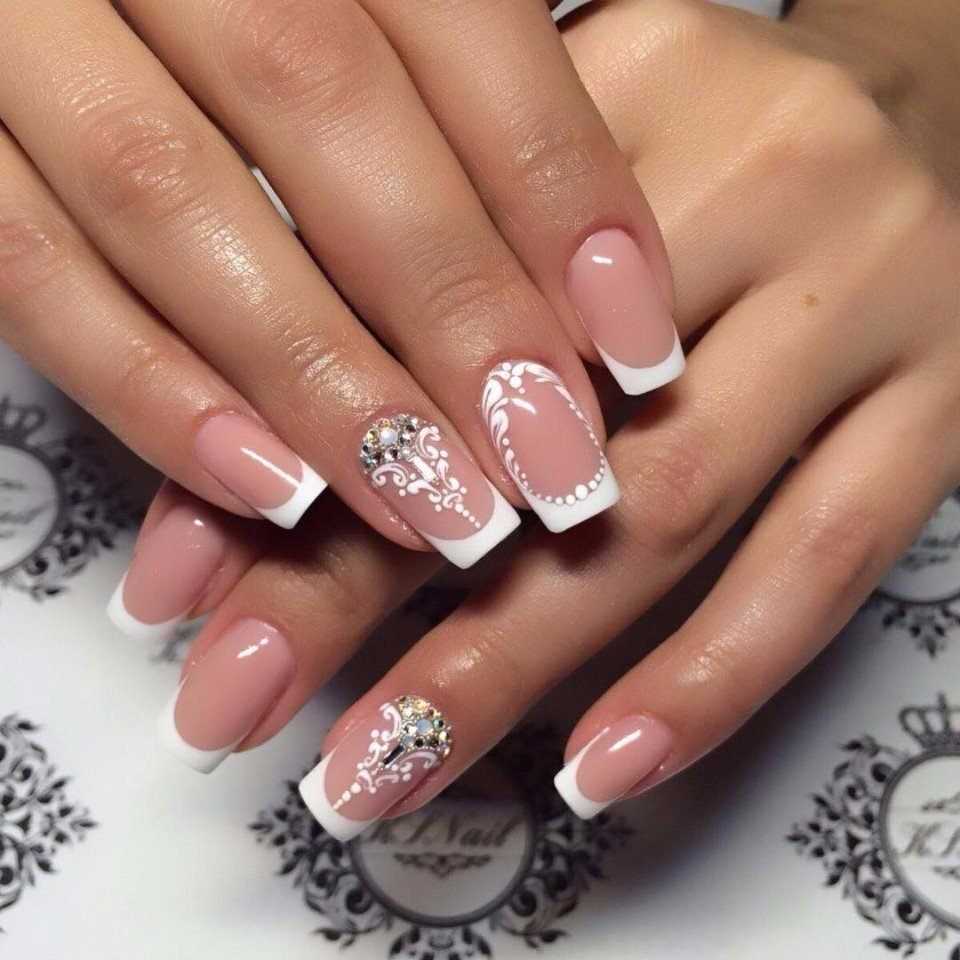 Элементы декора для белого французского маникюра подчеркивают нежность, женственность. Такие дизайны идеально подходят для свадьбы, других торжественных мероприятий. Лучшие идеи с рисунками и декоративными элементами: