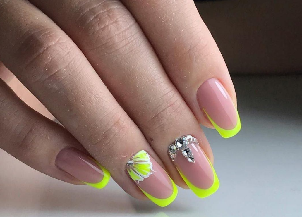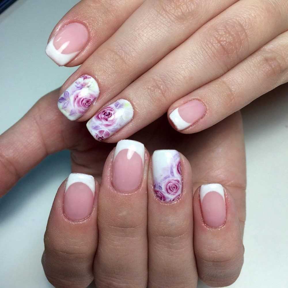 С френчем сочетаются почти все варианты дизайна. Наиболее актуальным в 2022 году вариантом маникюра на короткие ногти будет использование цветочных мотивов с цветной полосой по краю ногтя. Для подбора идеального сочетания можно вдохновиться идеями с фото.