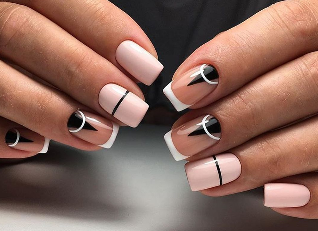 Френч можно наносить на ногти с разными дизайнами. Среди них особое место отводится варианту с геометрией. На первый взгляд может показаться, что плавная тонкая линия и фигуры не сочетаются между собой, но это не так.