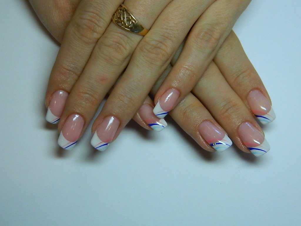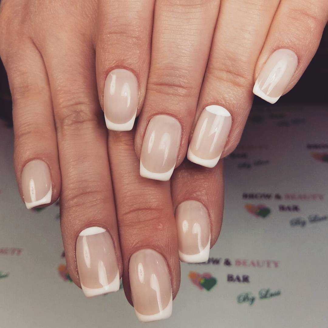 - Традиционный. Никогда не потеряет актуальности благодаря тому, что создает аккуратные, ухоженные пальчики. Основной цвет можно использовать нюдовый, но в классическом варианте – это прозрачный лак. Отросший ноготок около 1-3 мм выкрашивается в белый цвет. Его можно прорисовывать на основе натуральной длины либо делать более выразительную – от одного ногтевого валика к другому.
