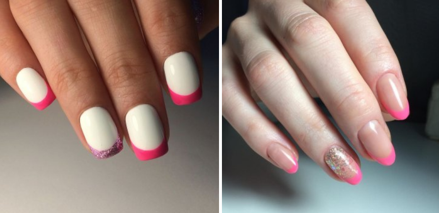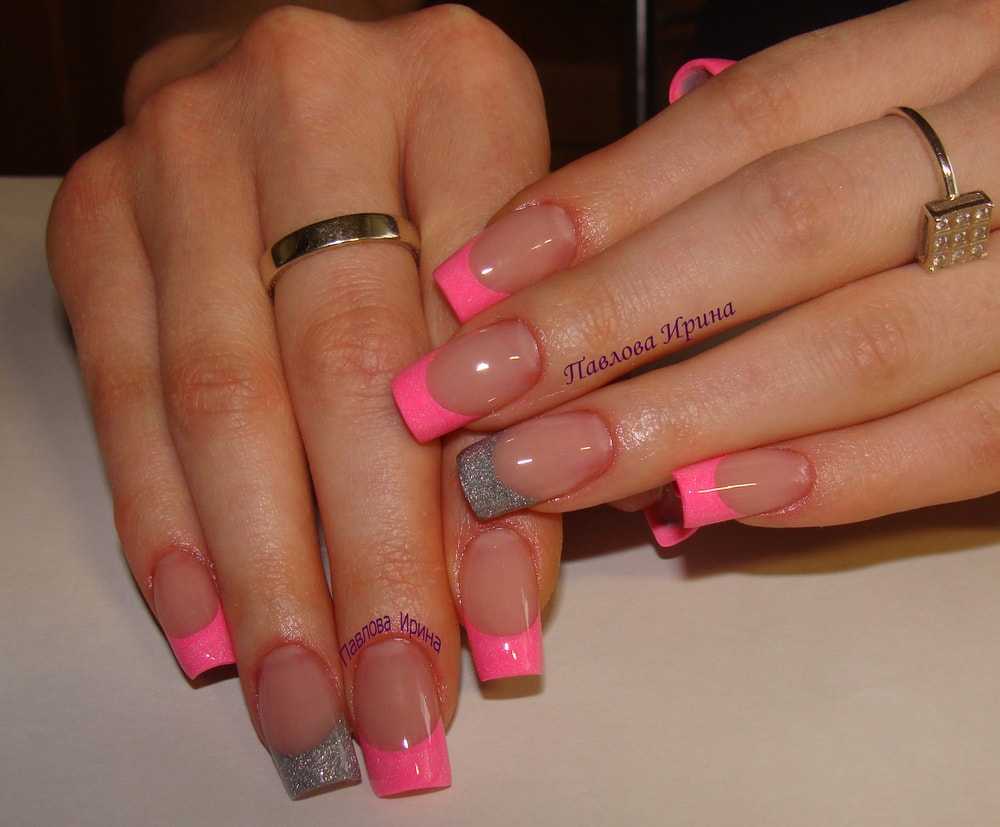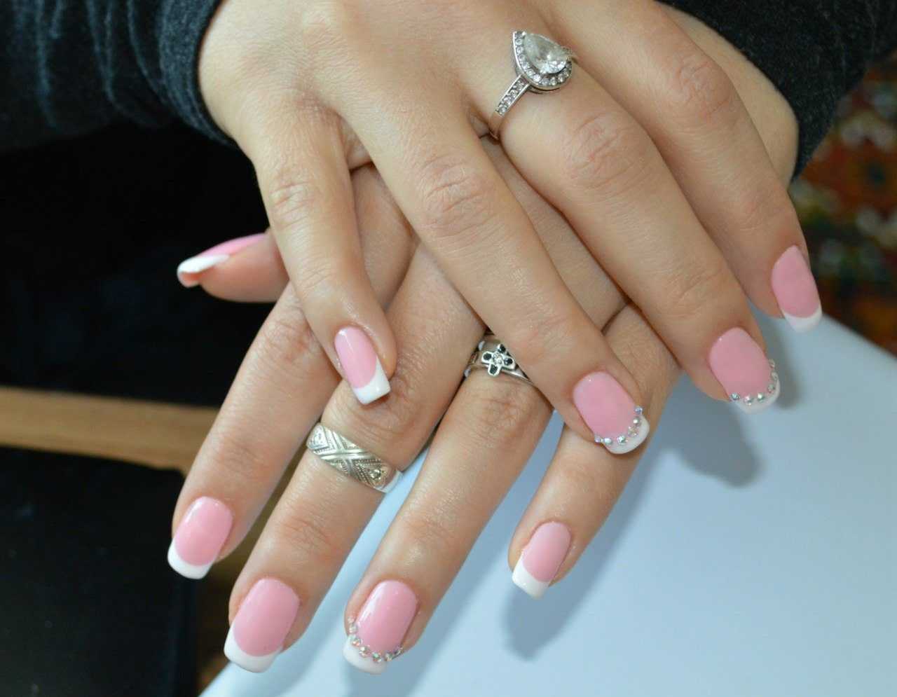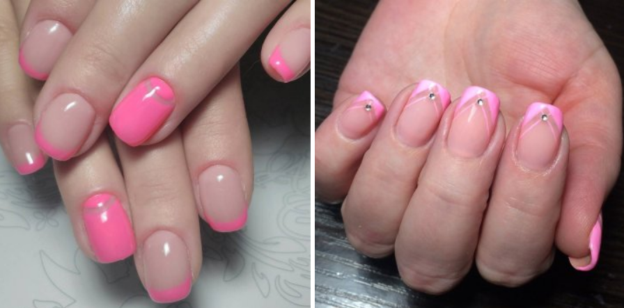 Строгий и сдержанный френч невероятно нежно смотрится в розовом цвете и считается весьма популярным среди посетительниц маникюрных салонов, ведь эта гамма интуитивно ассоциируется с нежностью, женственностью и романтическими чувствами. Для создания повседневного дизайна следует отдать предпочтение светлым и спокойным оттенкам. Если вас пригласили на вечеринку, то можно сделать выбор в пользу более ярких вариаций. Прекрасным тандемом для розового френча станут симпатичные узоры из страз, которые дублируют яркую полоску на кончике ногтя. Не менее оригинально смотрится в такой компании хаотичная россыпь блестящих элементов и многие другие примеры