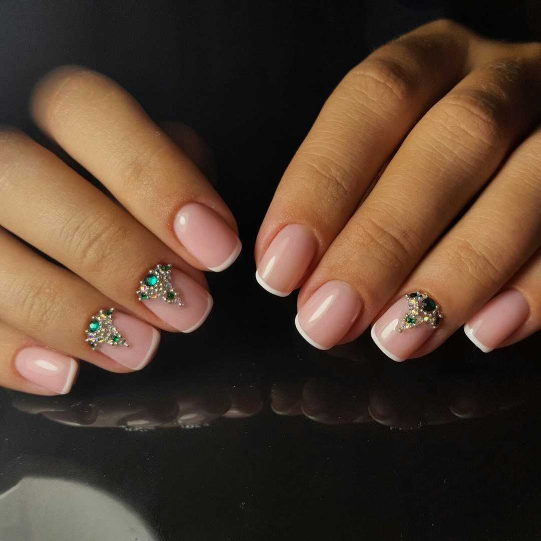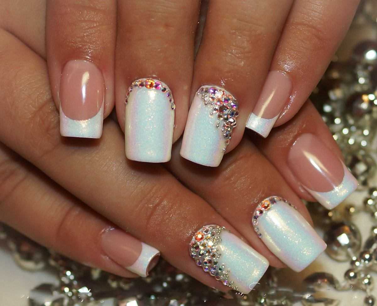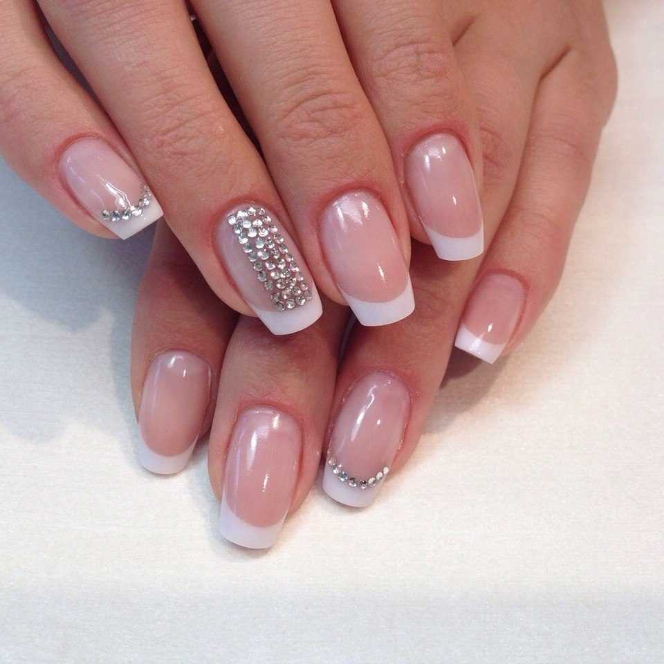 Для дизайна френча лучше выбирать стразы серебряного цвета. Они универсальны и не дешевят образ ярким оттенком.