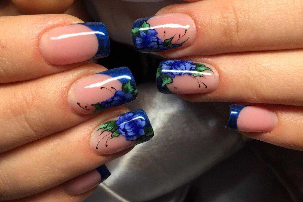 Одна из лучших идей — белый френч и цветы василькового цвета. Бутоны должны быть небольшими, стебли и листья — аккуратные тонкие линии. Розы, маки и другие красные цветы в 2022 году будут неактуальны. Поэтому их на ногти лучше не наносить.