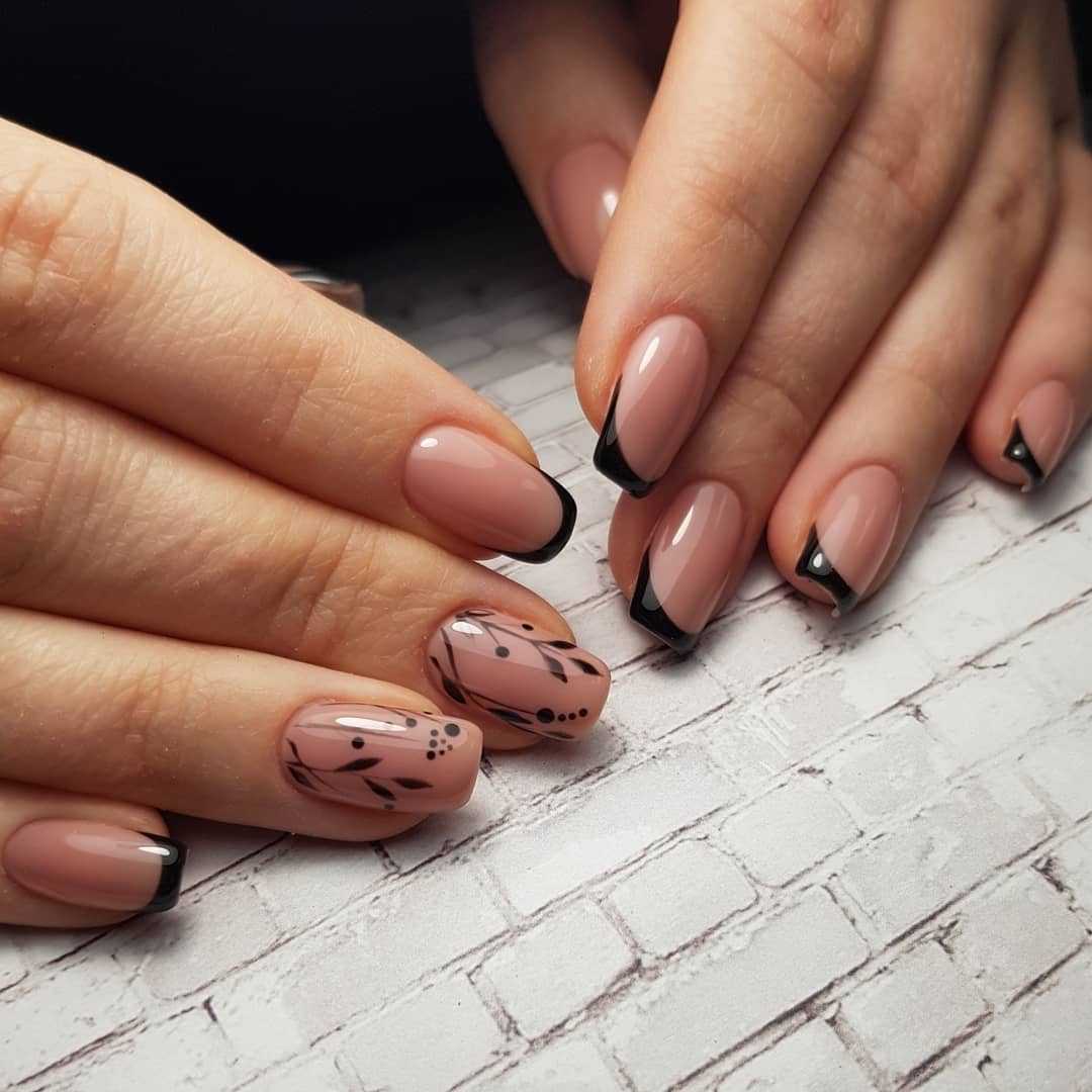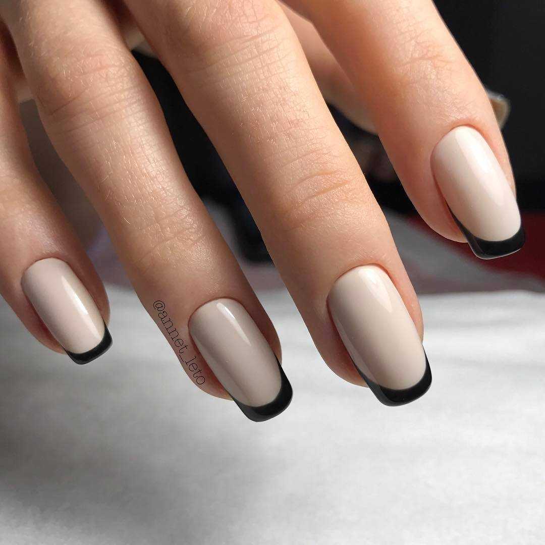 Асимметрия — это возможность сделать привычный маникюр с черной каймой более стильным и индивидуальным. Скошенная линия улыбки отлично вписывается в дизайн с геометрией или черно-белым мрамором.