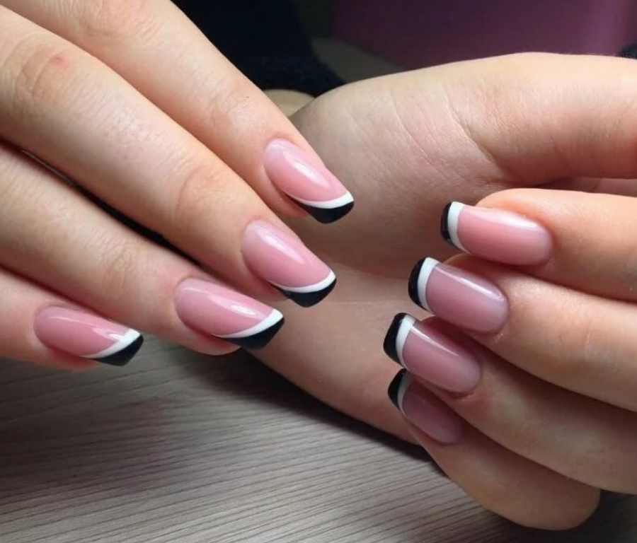 Сюда относят, например, твист френч. Для его создания используют не только черный, но еще один — контрастный — оттенок лака. Это может быть белая, серебристая, золотая, синяя и другие полоски. Они идут по направлению друг к другу и могут соединяться или идти параллельно.
