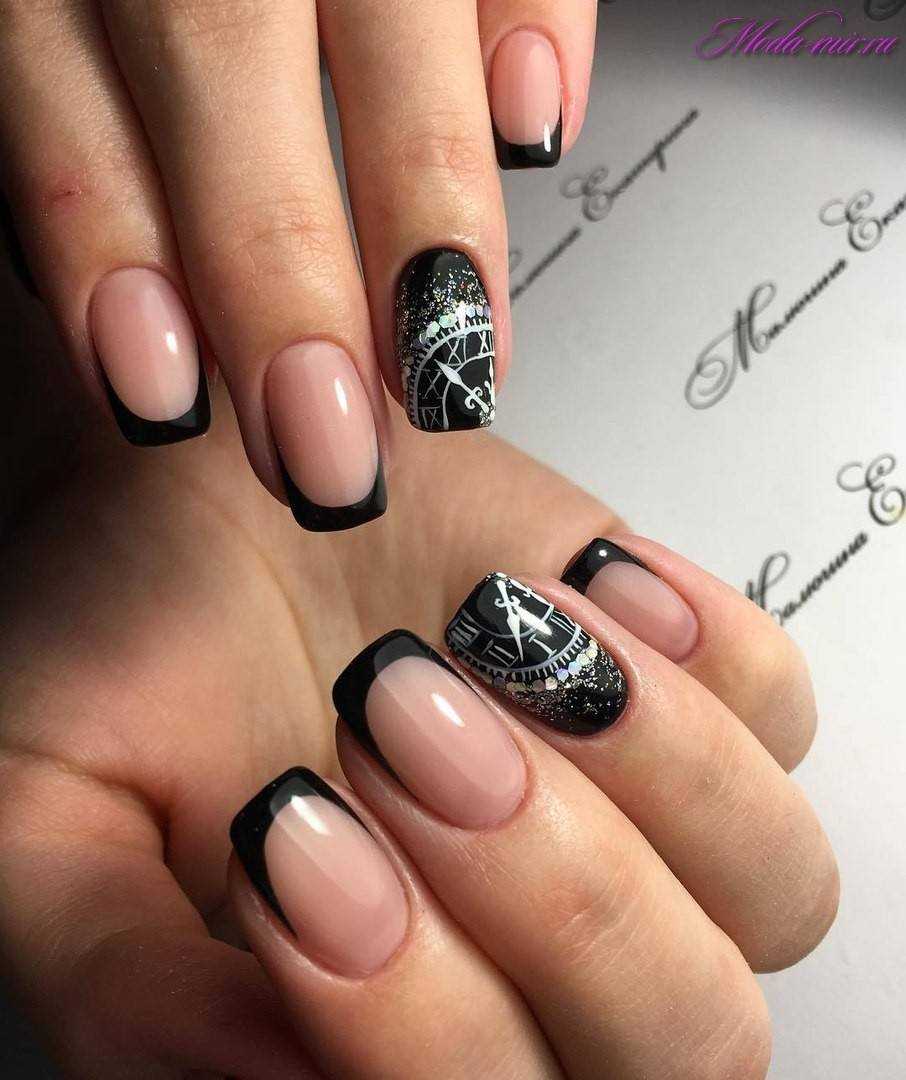 Черный французский маникюр — изысканно и элегантно. И ничуть не мрачно, хотя многие модницы именно по этой причине не решаются делать такой дизайн. Особенно эффектно черный френч смотрится с тонкой аккуратной линией, повторяющей форму краешка ногтя. Допустимы любые варианты дизайна.